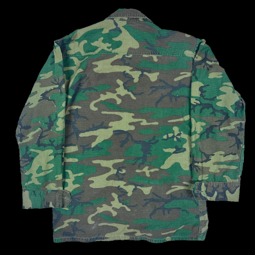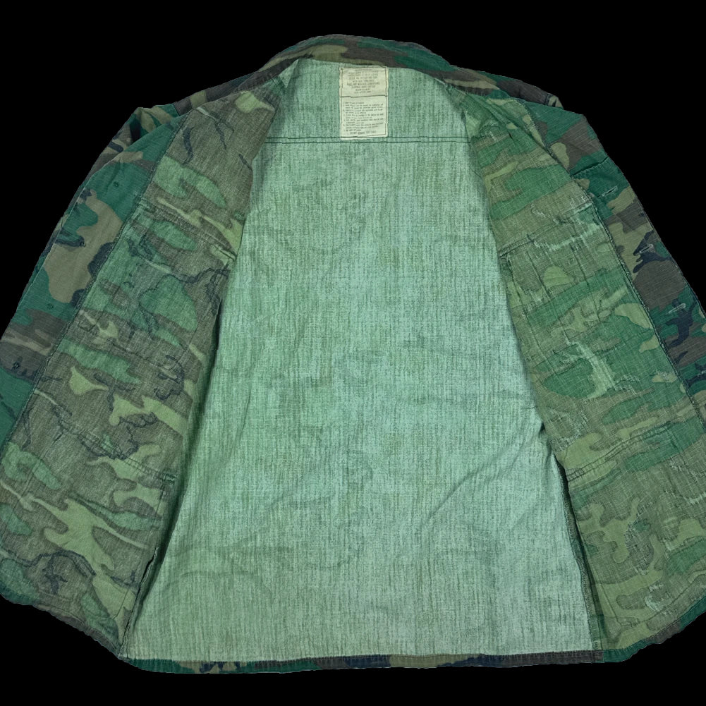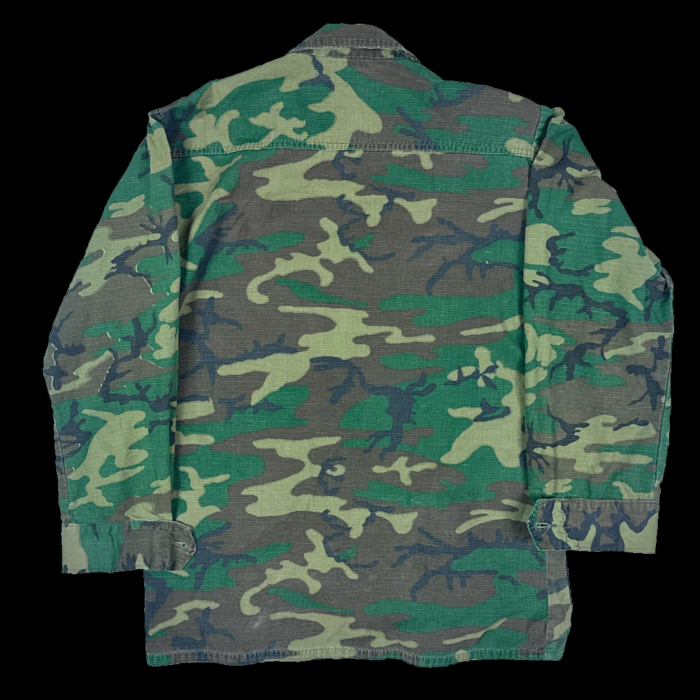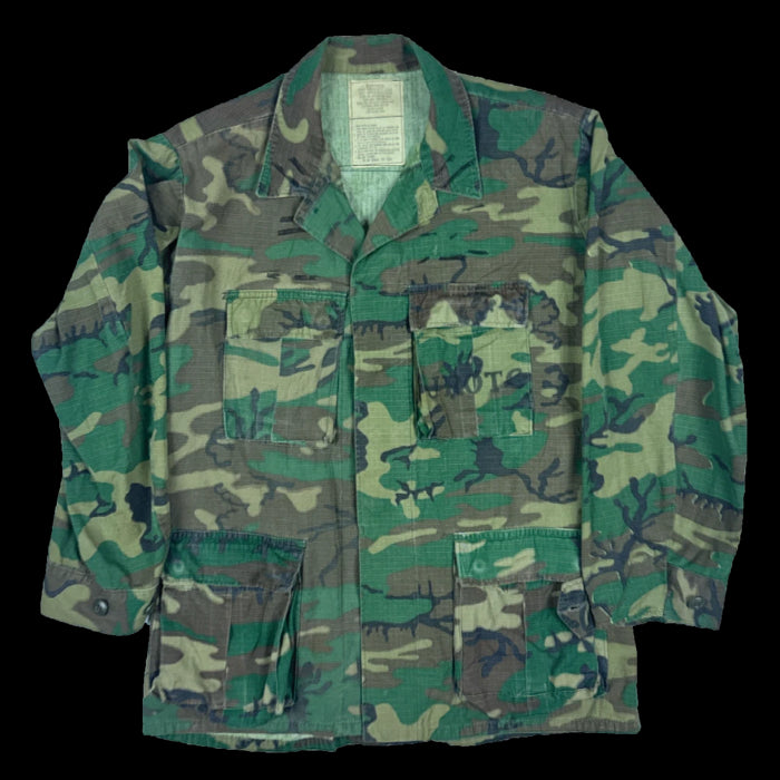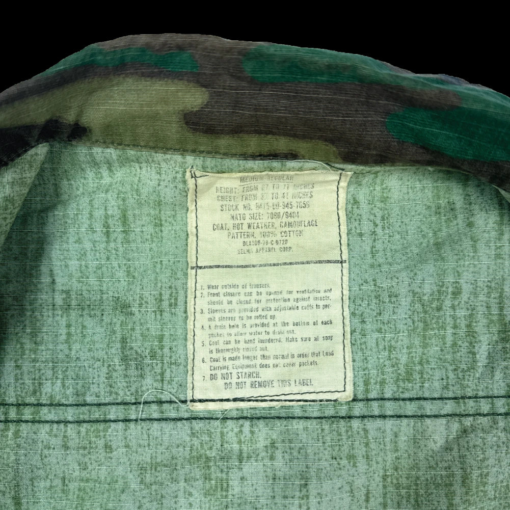 US JROTC RDF ERDL ripstop shirt in Medium Regular. Manufactured in 1978. Features ERDL camouflage and a ripstop construction with a four-pocket layout and button-adjustable cuffs.
