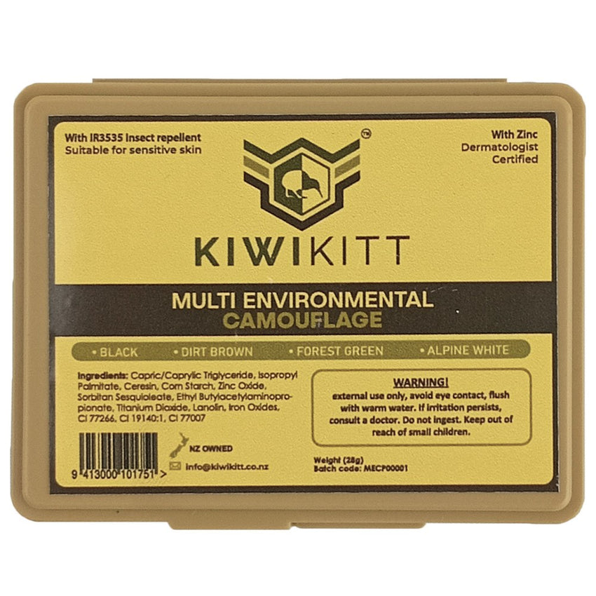 New Zealand owned, KiwiKitt set out to improve the world of camouflage face paint - and that they did. Incorporating insect repellant and a bit of sun protection, they also made this face paint easy to use. No one wants to use useless or annoying camo when it matters. KiwiKitt developed this four colour palette (black, dirt brown, forest green & alpine white) with the user in mind, as well as effectiveness. Buttery smooth application and blending, with easy wipe off removal. Somehow not skimping out on colour pigment. Wizardry, perhaps. Clever and useful, definitely. Tested in a range of hot to cool, wet to dry environments, KiwiKitt is serious about making a reliable product.
