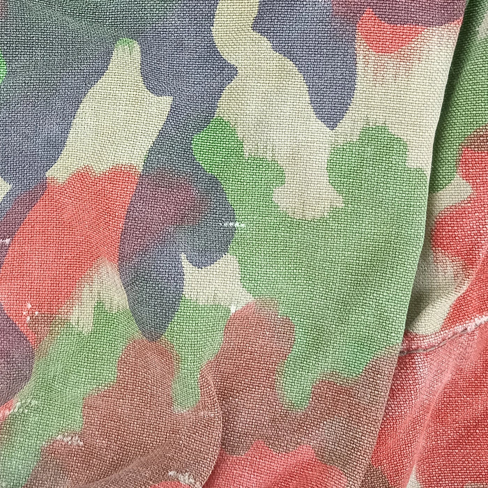 This one dated from the 50's, either 1956 or 1952 (more likely '52, given the first stamp is usually size and the chest flat also measures 56cm)- we say either year date because the interior stamps have been overprinted. Adding to the canvas jacket is an included canvas pack which famously integrates with the jacket itself. While rugged, this jacket has fading and some damage, especially wearing on seam edges and pocket corners, small holes and repairs. An awesome, hefty piece of Swiss gear.