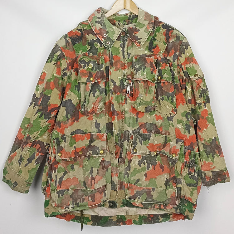 Usually we stock TAZ57 or TAZ83 (alpenflage) M70 model jackets however this one is unusual. This Swiss jacket is made from canvas in the M61 pattern, with the bayonet attachment to the front right, smooth domes, interior pocket to the back bottom left pouch, inner wrist cuffs and angular elbow reinforcing (not vinyl, rejoice!). While the Swiss M61 jacket is not terribly rare, these made from canvas are.