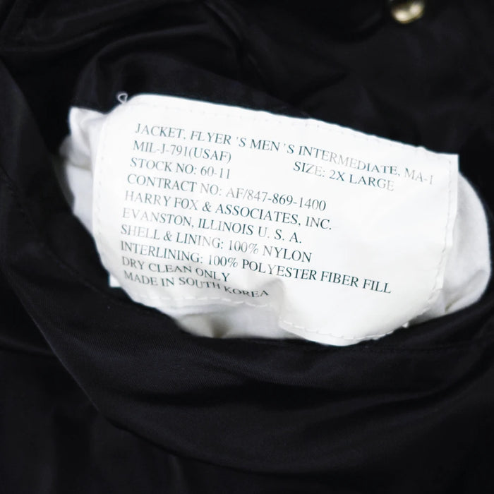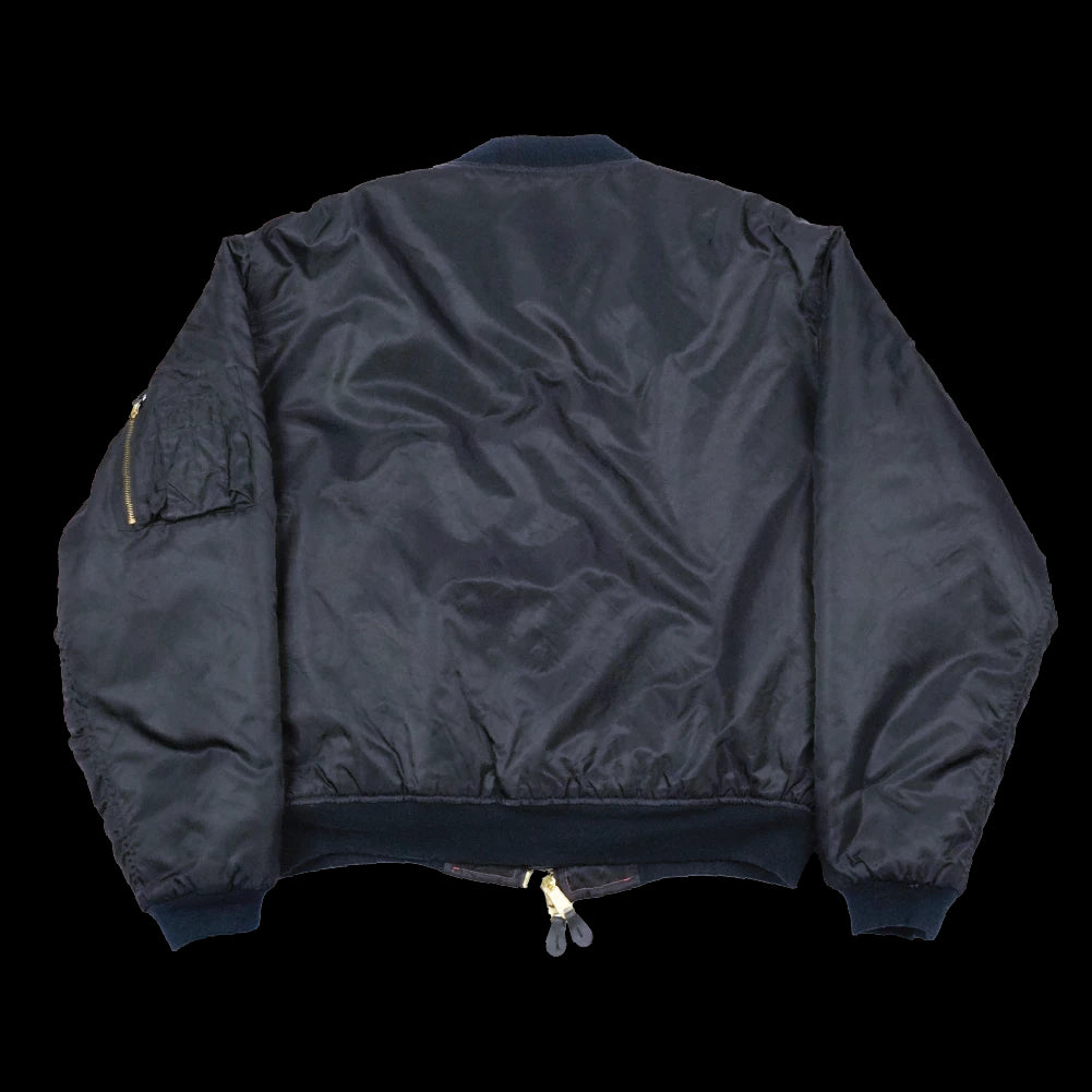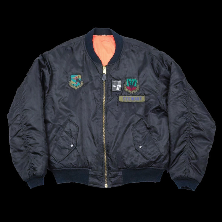 Commercial MA-1 style flight jacket with a reversible design. Nylon and polyester construction with elasticated collar, cuffs, and waist. Features multiple pockets and a safety orange reverse side.
