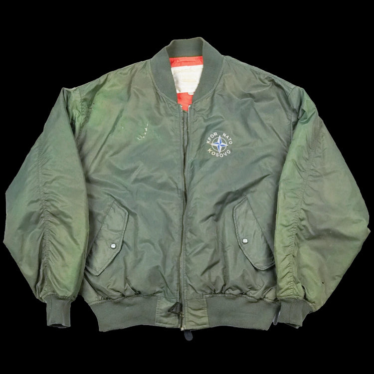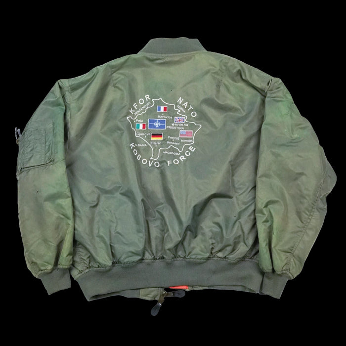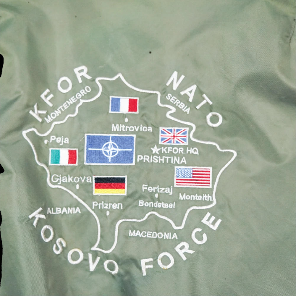 This example shows burn holes, fading, and the main zip requires attention to function. Features insignia of the KFOR NATO mission in Kosovo, along with an embroidered map on the back showing deployment locations for the nations involved.