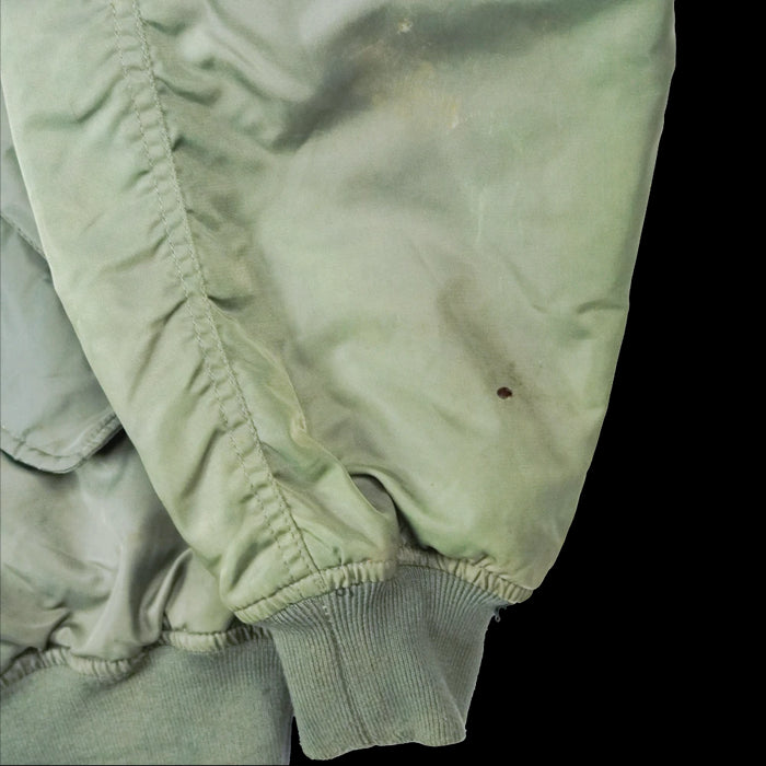 Commercial MA-1 style flight jacket with a reversible design and safety orange reverse side. Nylon and polyester construction with elasticated collar, cuffs, and waist, plus multiple pockets including a utility/pen pocket on the left sleeve.