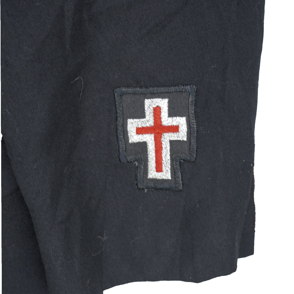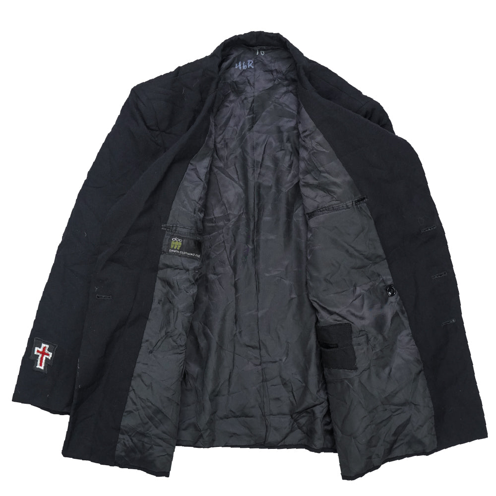 Double-breasted Masonic Knights coat with a formal overcoat-style design and front button closure. Structured outerwear piece with a traditional double-breasted front.