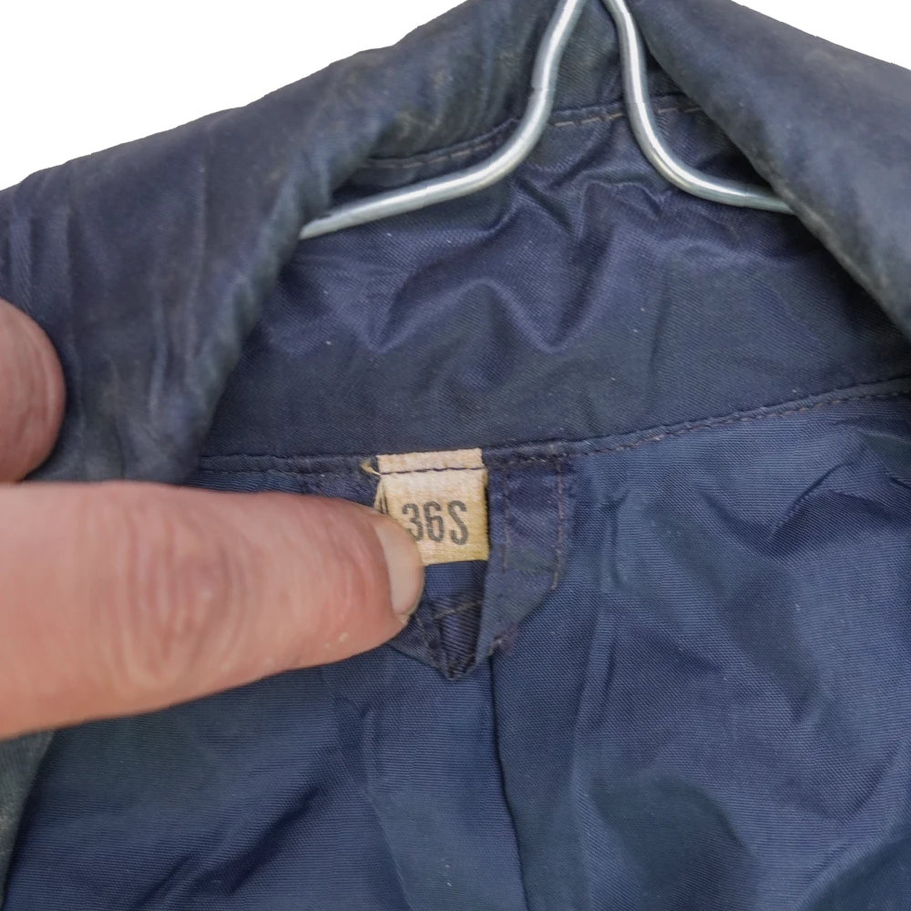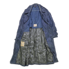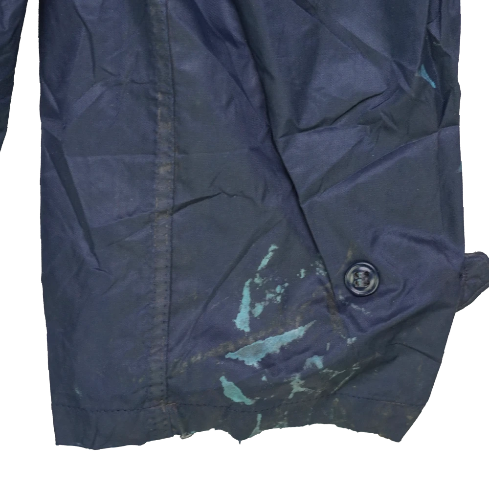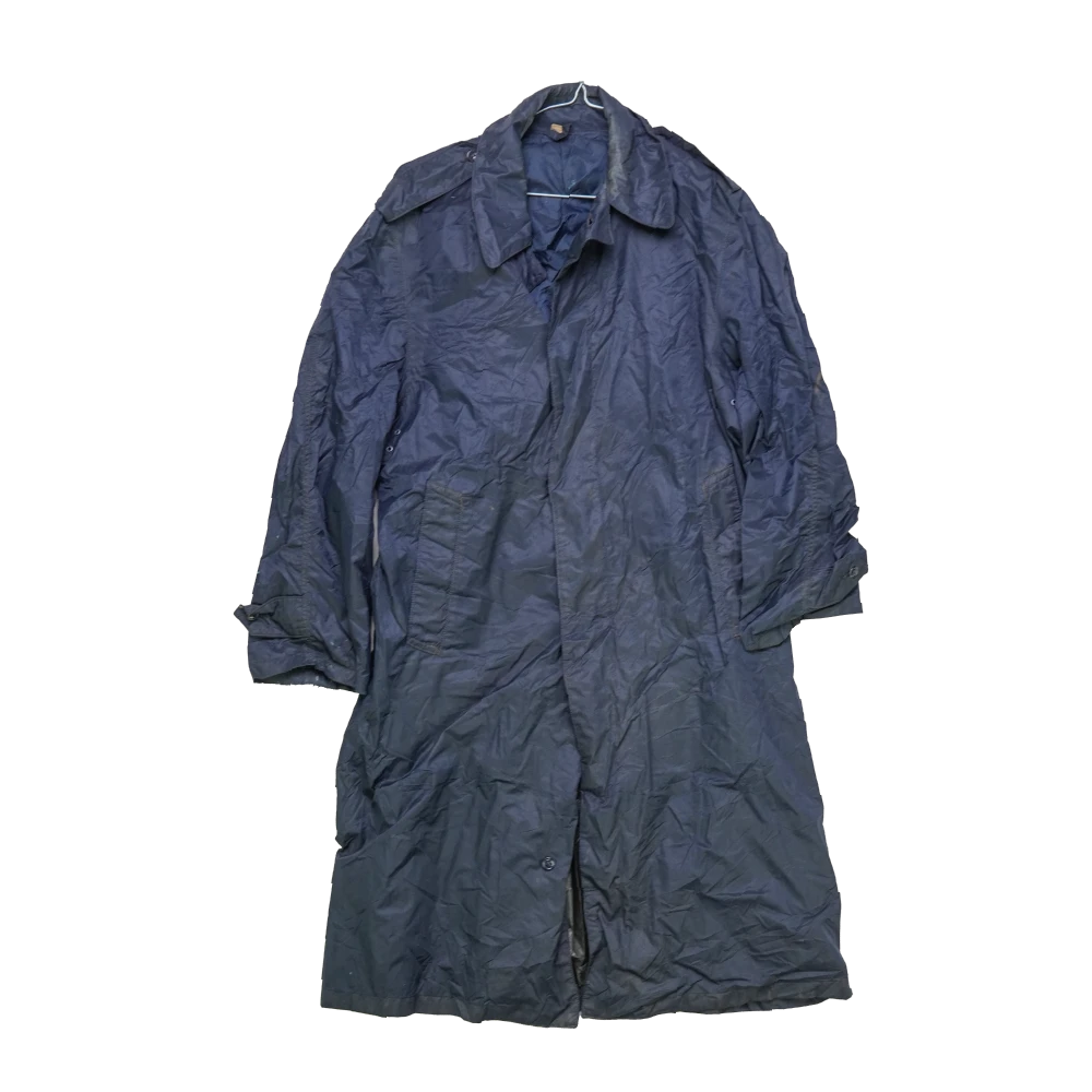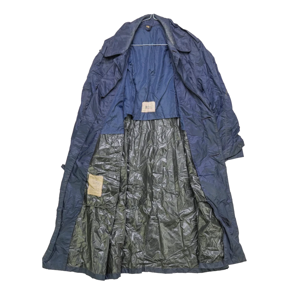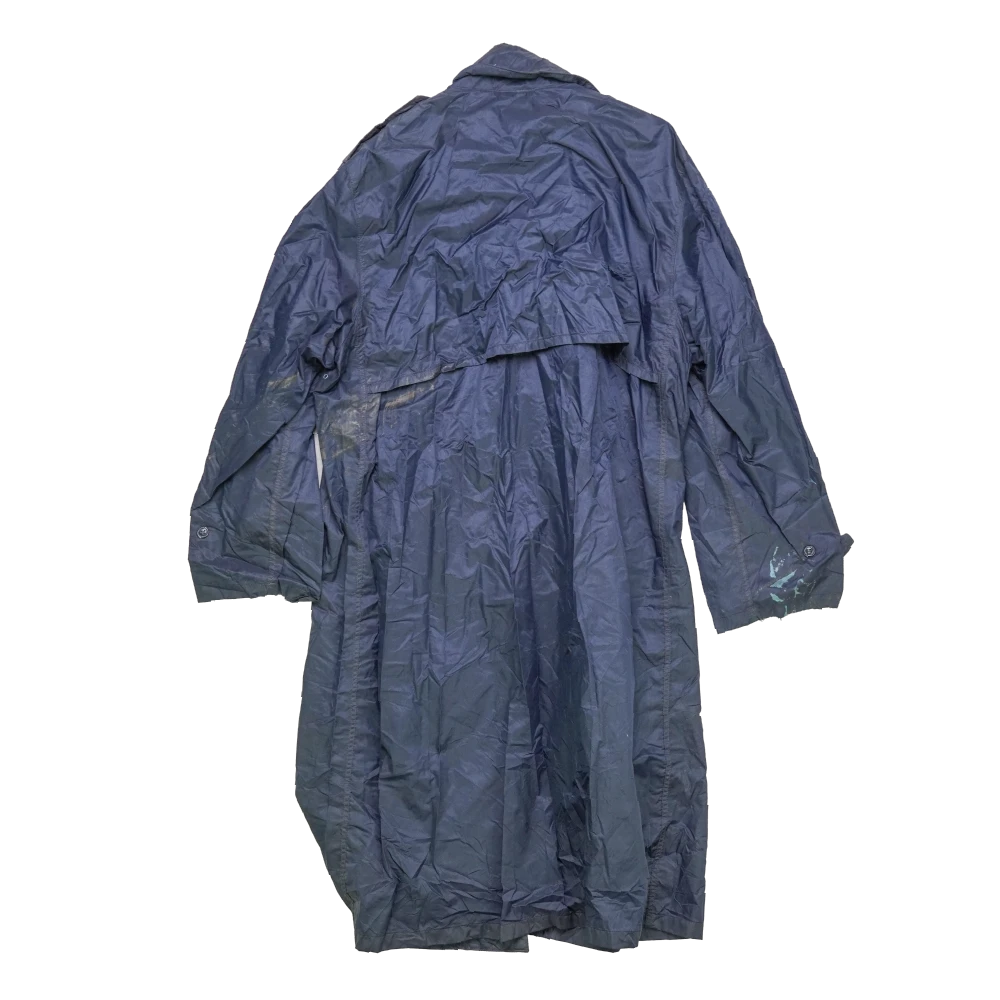 U.S. military issue lightweight raincoat in blue. Features a simple waterproof shell construction with full-length front closure and long sleeves.
