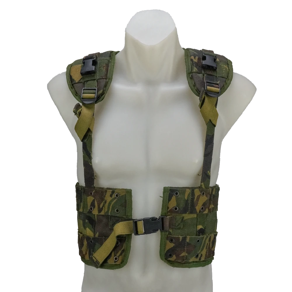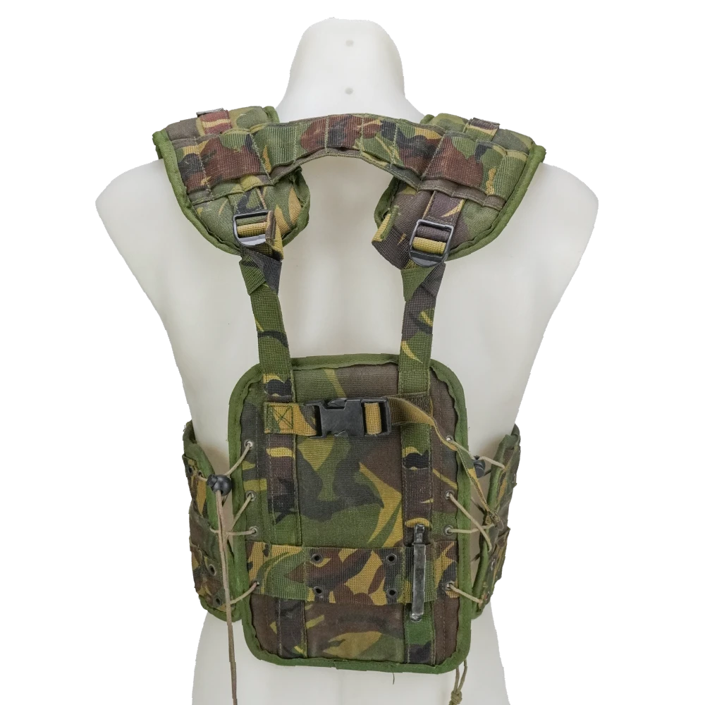 Dutch DPM M93 combat vest with production modifications. Features multiple integrated storage compartments and front closure system. Modified condition may affect original configuration.