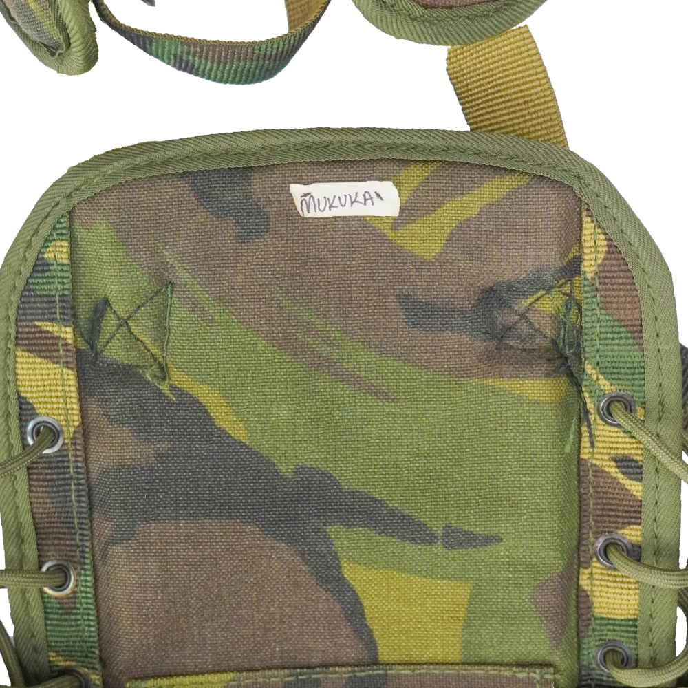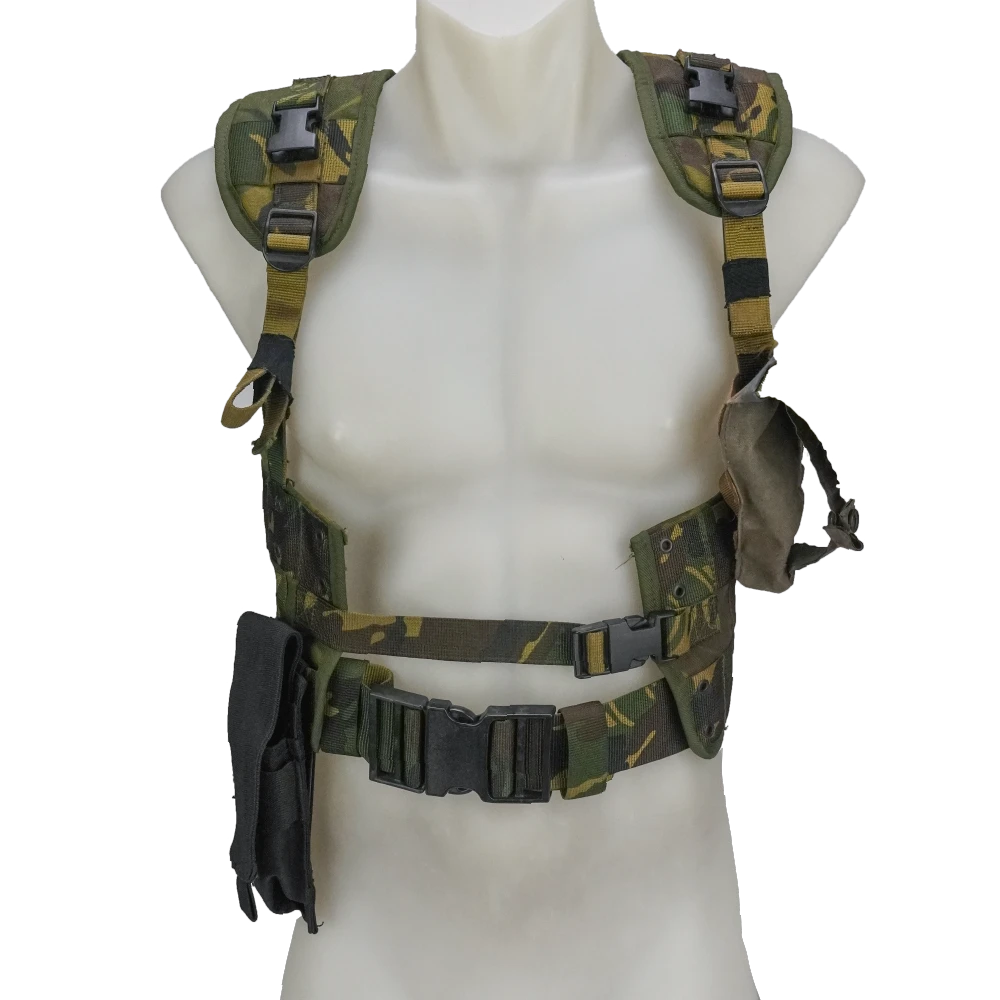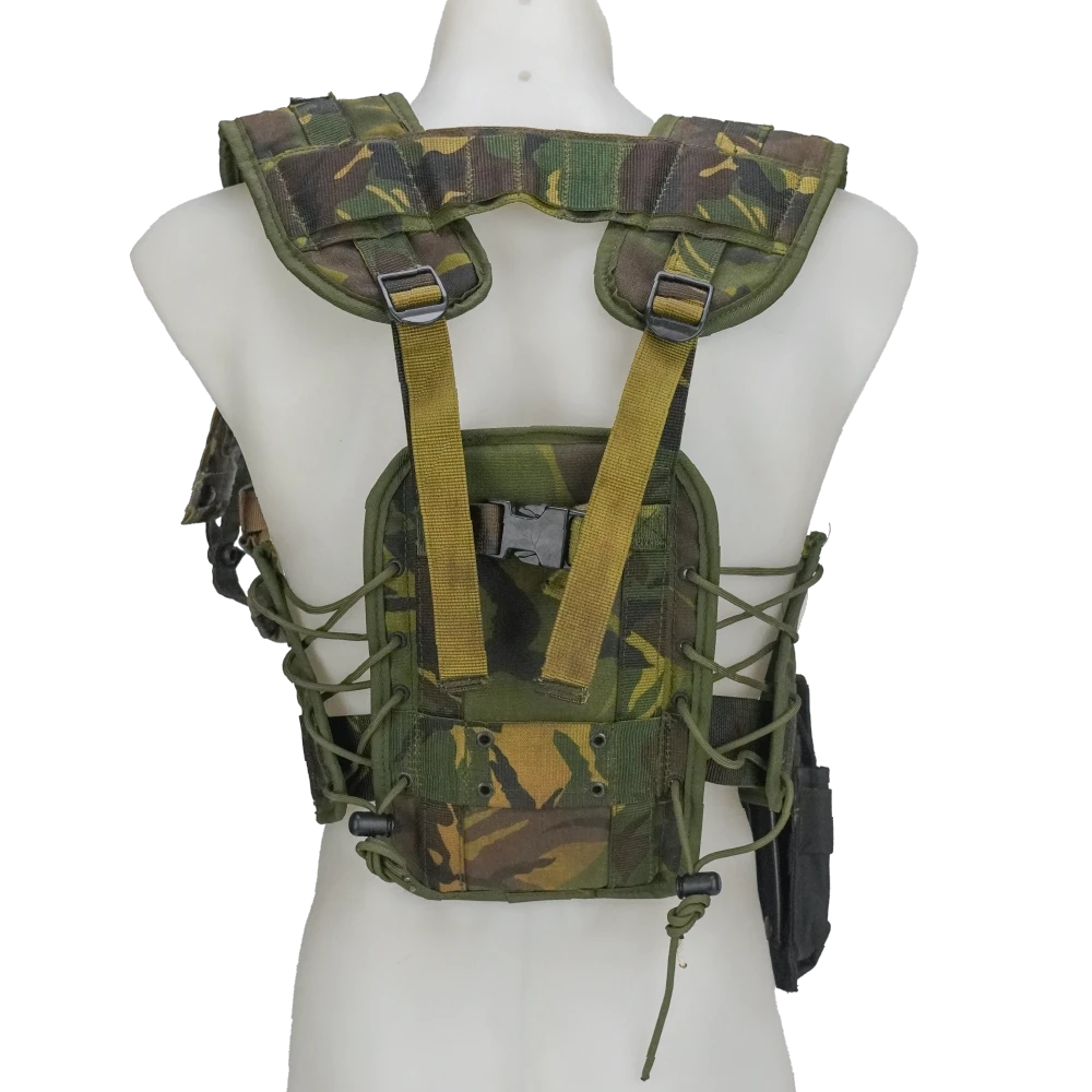 Modified Dutch DPM M93 combat vest with attachments. This vest is in Dutch DPM camouflage and includes attached components as listed in the title. This is an ex-film production stock item and has been modified.