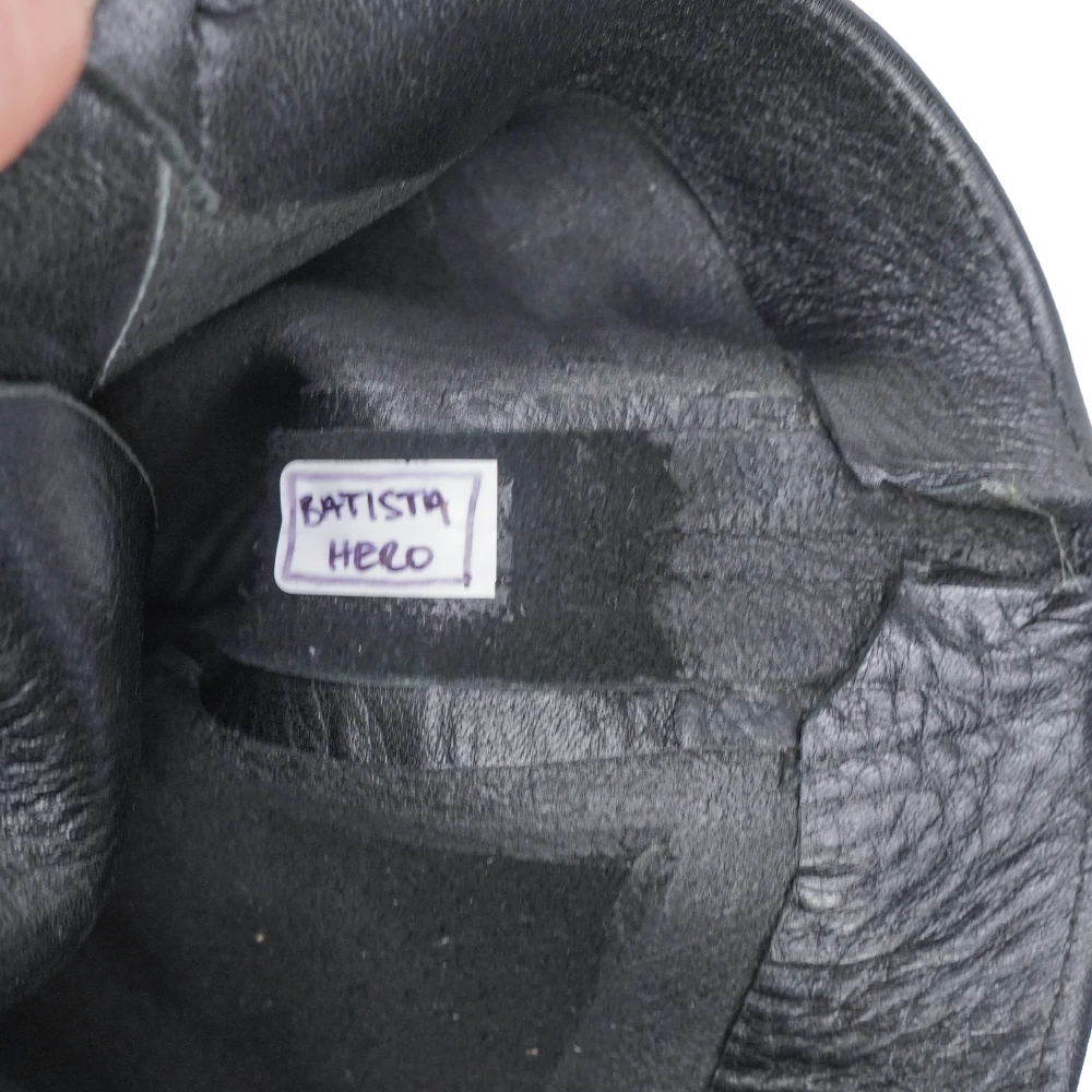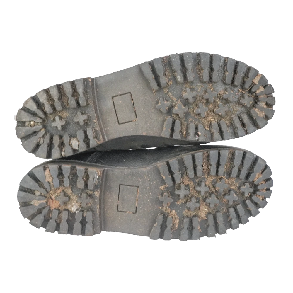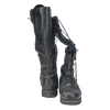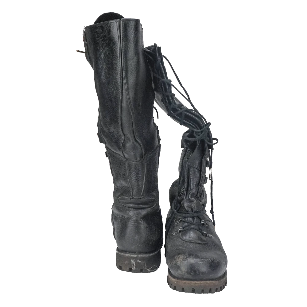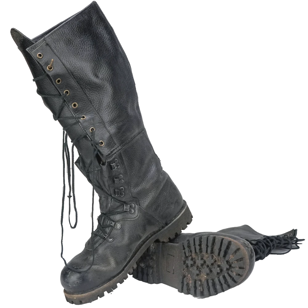 Modified German Army Model 2000 combat boots in a tall lace-up pattern with heavy tread soles. This pair has a high shaft, lace closure, and buckle strap sections on the upper.