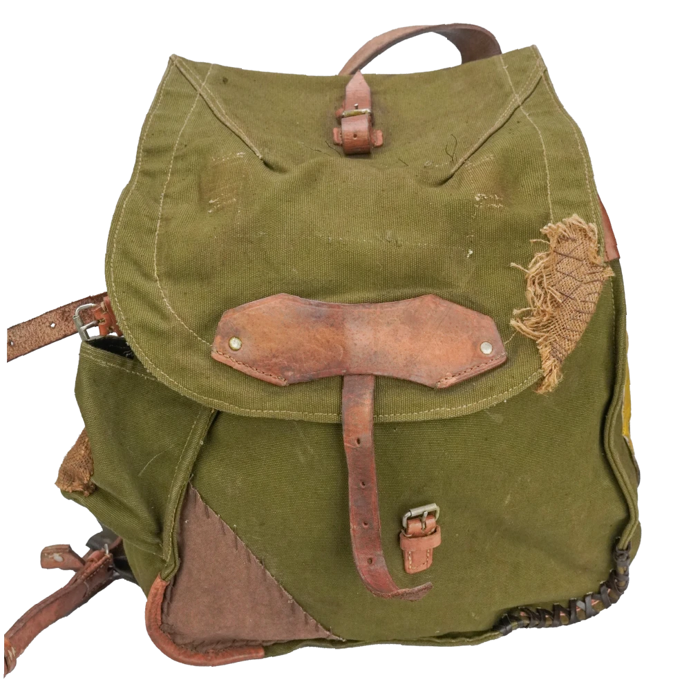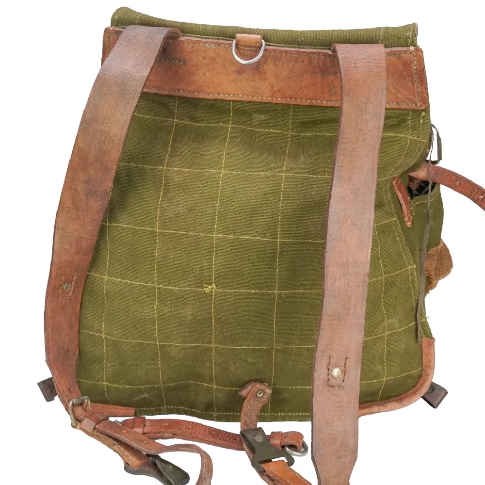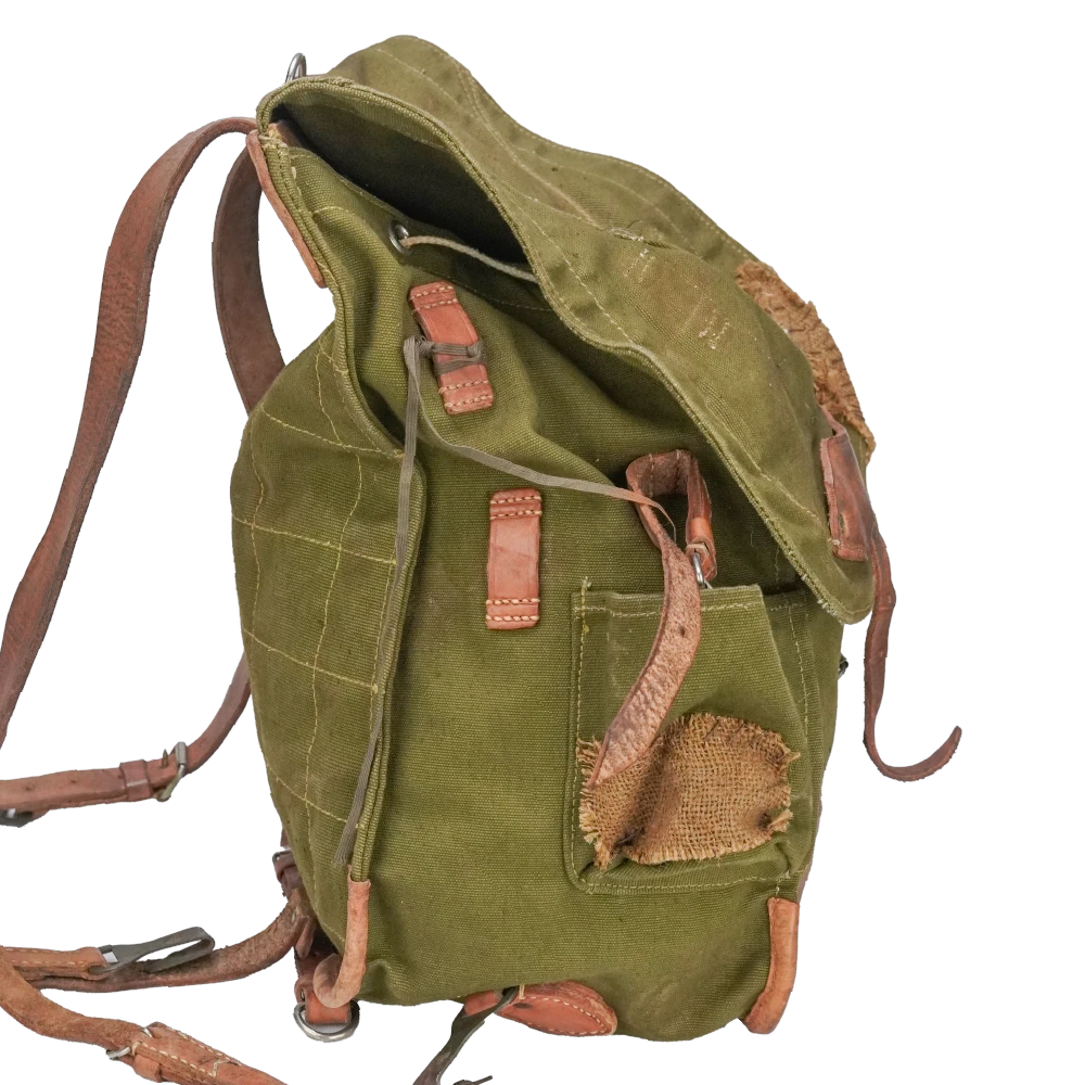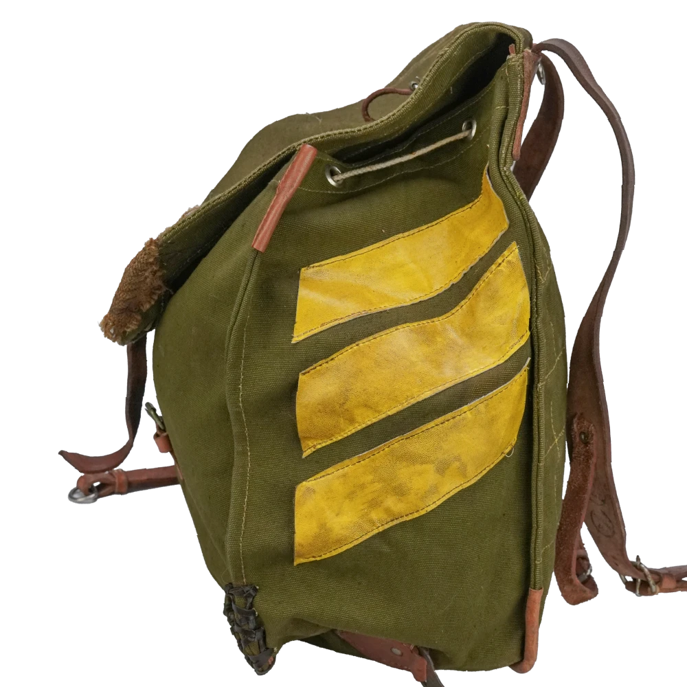 Romanian surplus canvas rucksack modified for film production use. Heavy canvas construction with a simple pack layout and external attachment points.