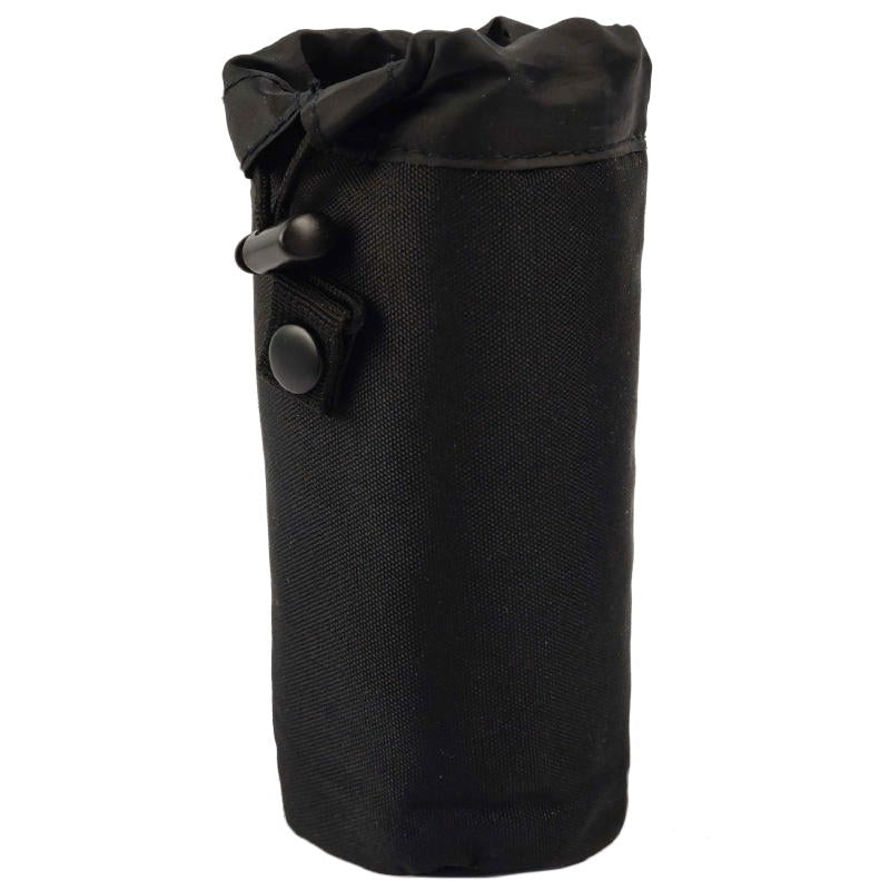 Sit your preferred hydration device inside the lined pouch and secure it in with the top drawstring. This drawstring can be secured to the side of the pouch with a snap dome to prevent snagging. The pouch is lightly insulated to keep your hot drinks hot and your cool drinks cool. With a diameter of 7cm, you can fit a range of plastic and glass bottles or thermal flasks. This will be able to hold most standard 750ml water bottles and (more importantly) your standard 330ml "emergency refreshment" glass bottles.