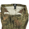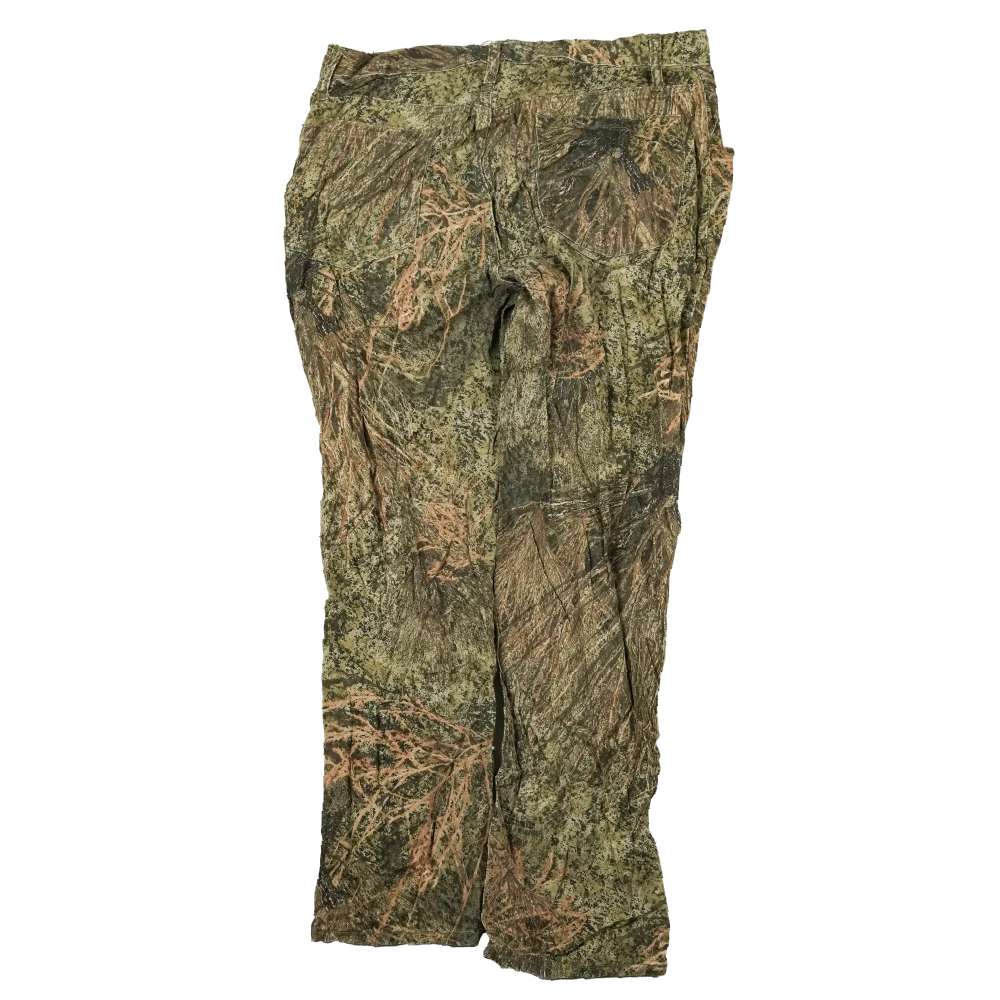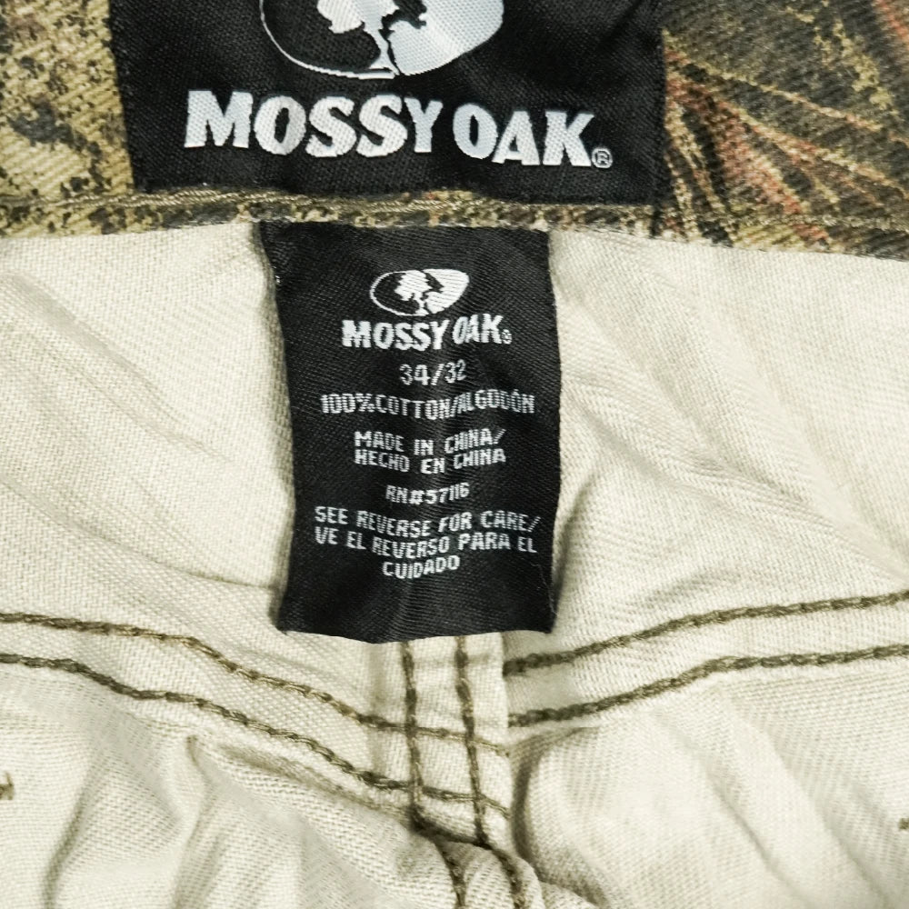Commercial Mossy Oak hunting pants in a printed camouflage pattern. Full-length trousers with a standard cut.