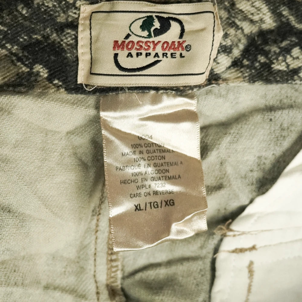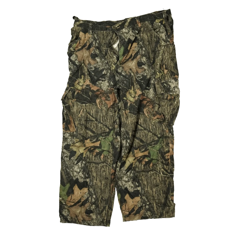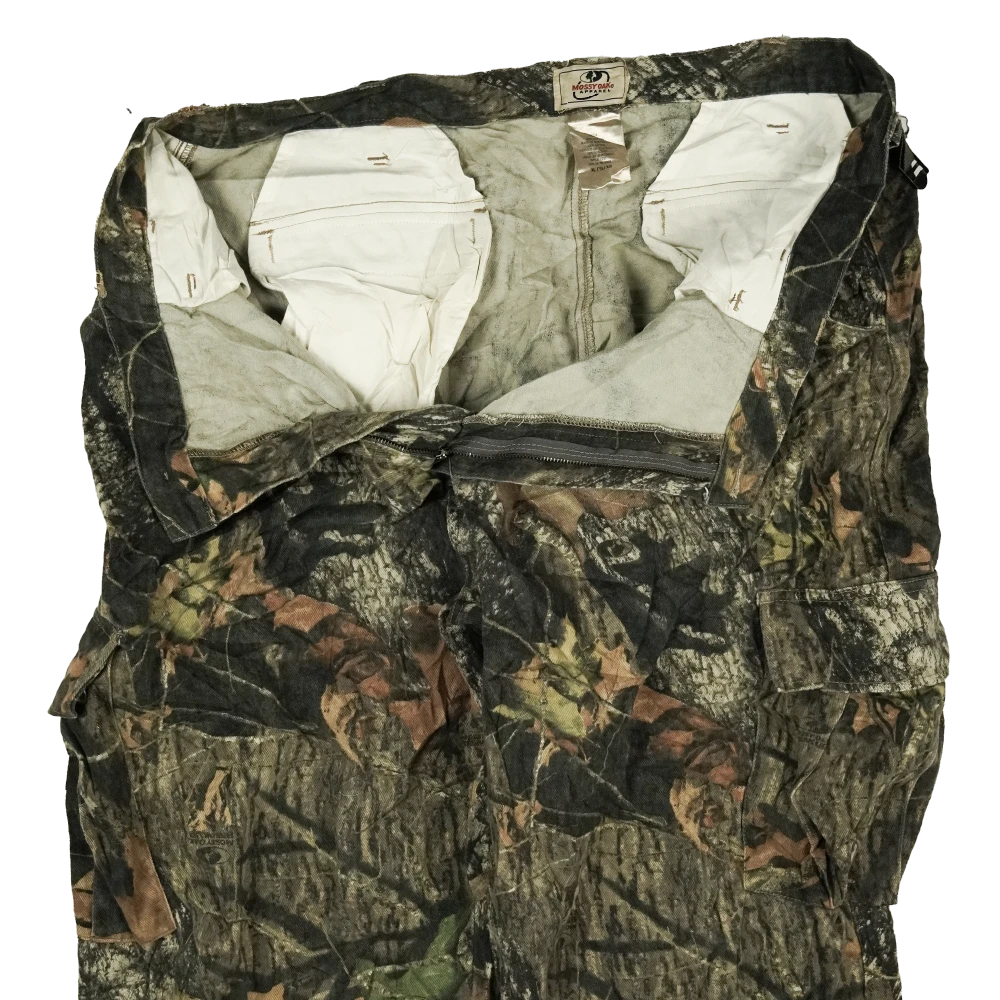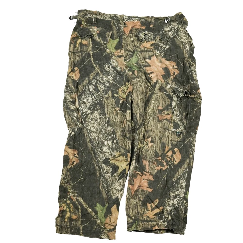 Commercial hunting-style trousers in a Mossy Oak camouflage pattern. The pants are in used, very good condition with no faults noted in the provided information.