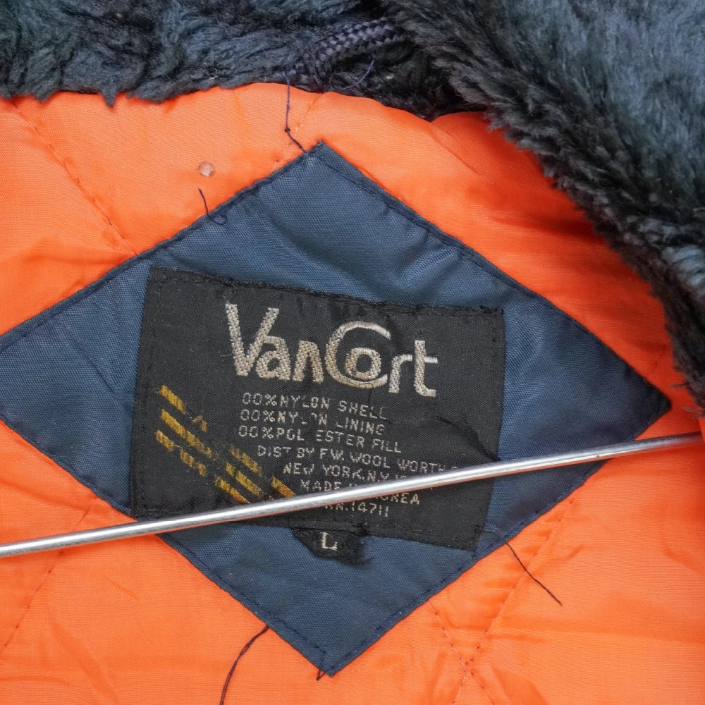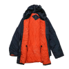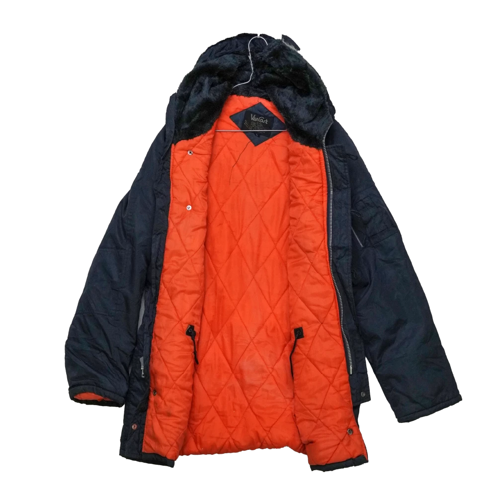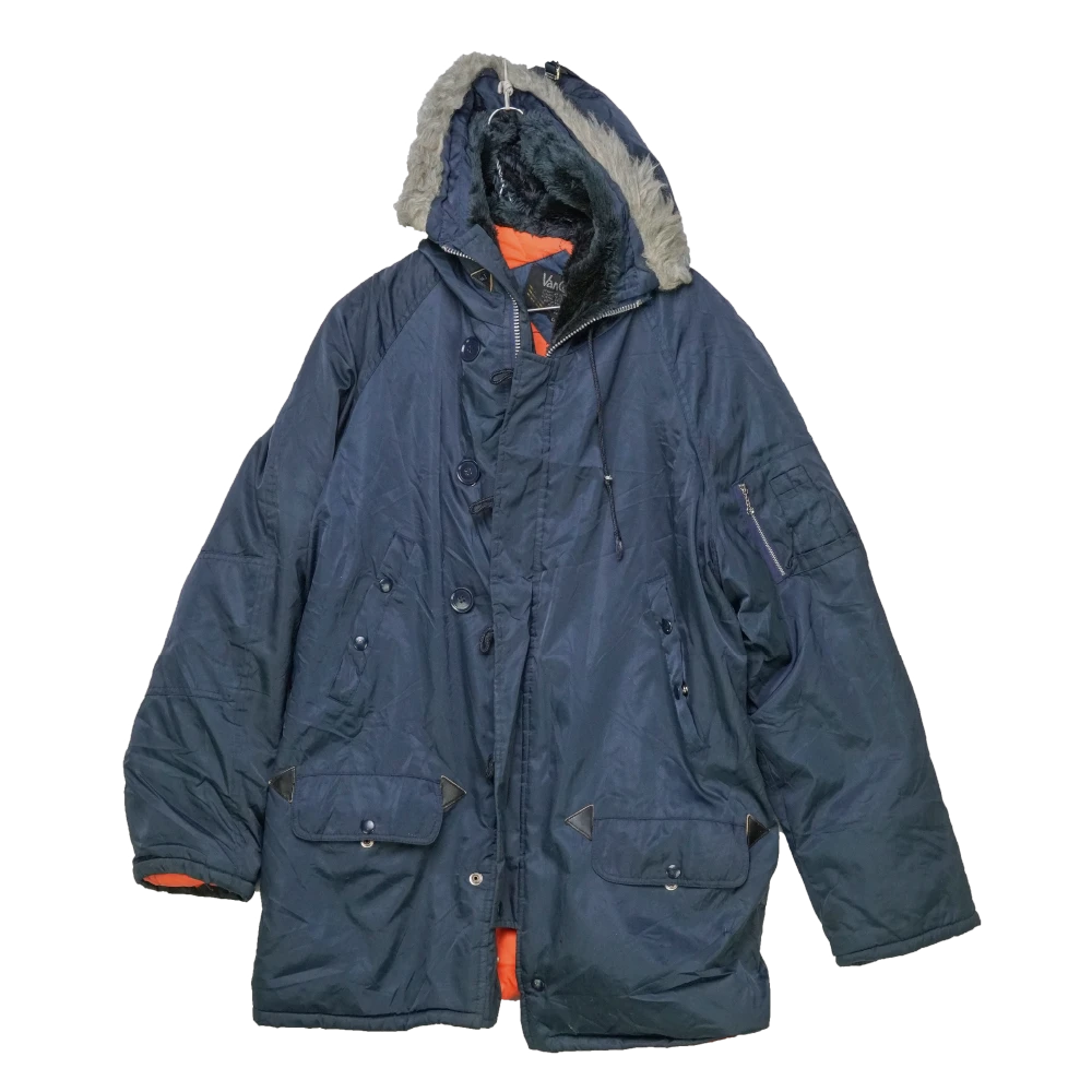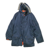 Commercial navy blue military style parka in a standard long cut. Simple outer layer with a classic parka-length silhouette and long sleeves.