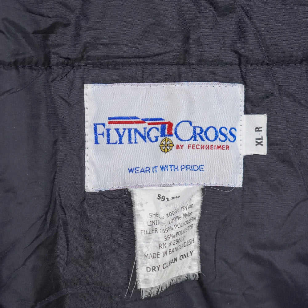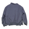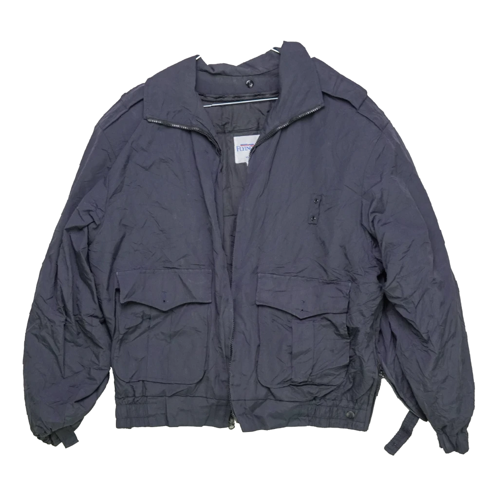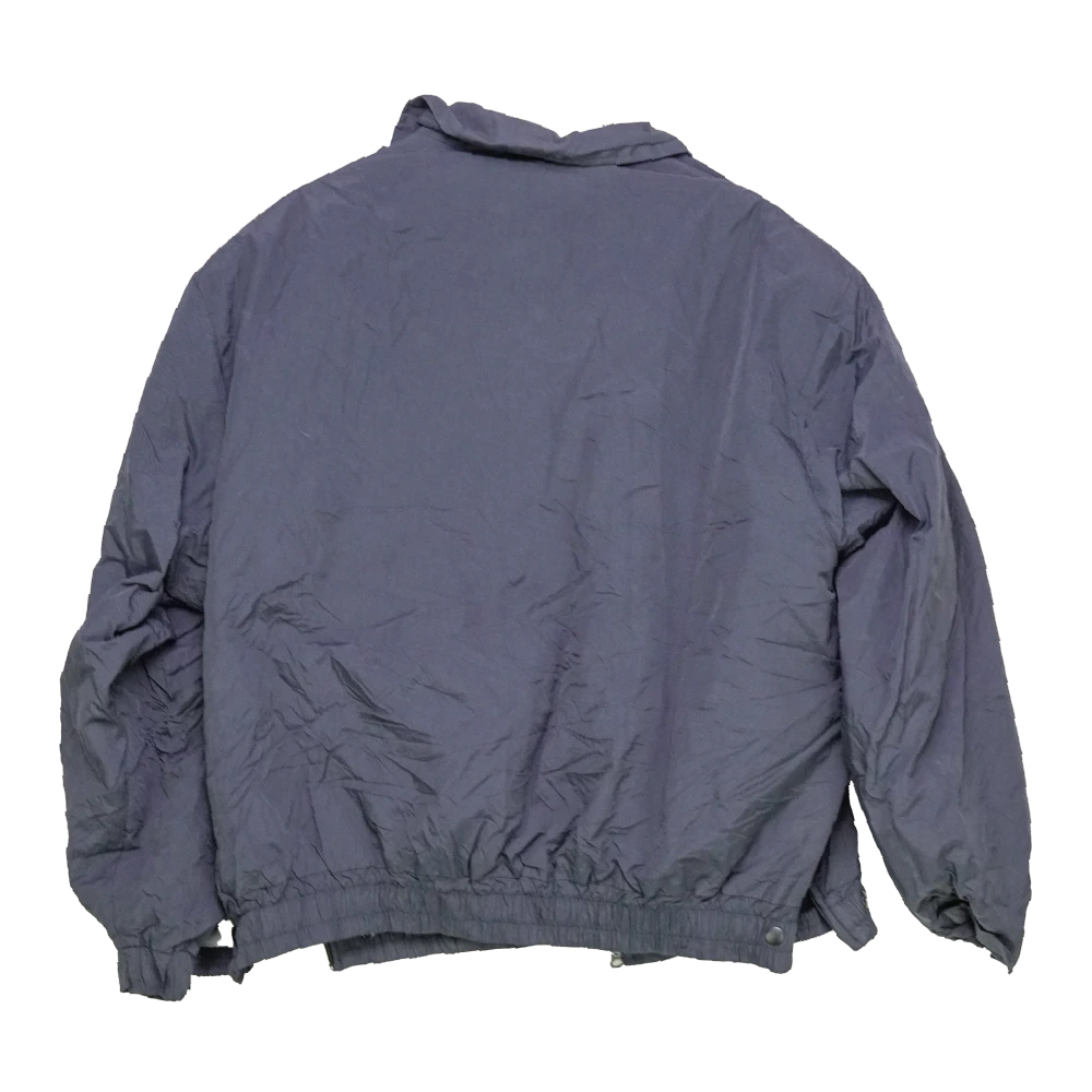 Commercial navy blue nylon bomber jacket in a classic flight-style cut. Lightweight synthetic outer with standard bomber styling and front pocket detailing.