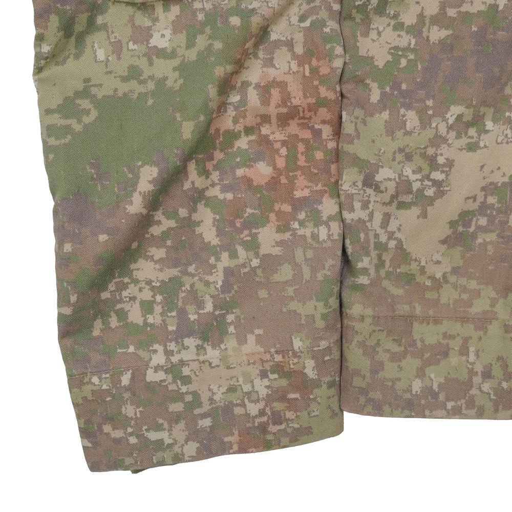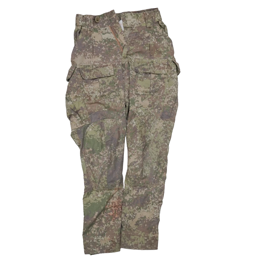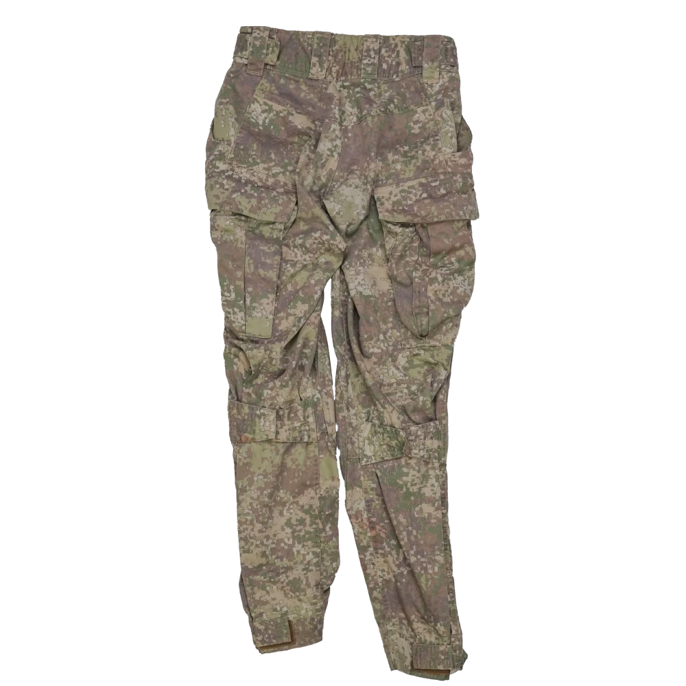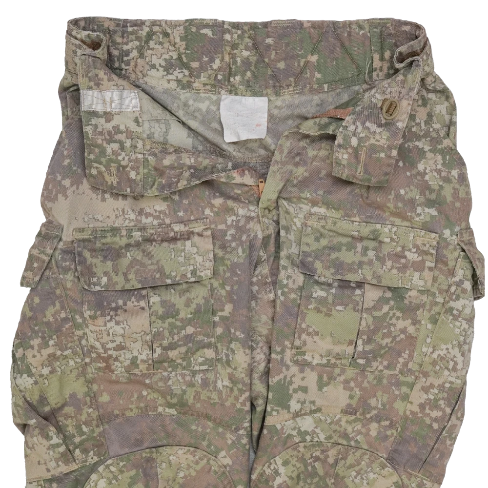 New Zealand Army field trousers in MCU camouflage pattern. Constructed with a zip fly and button waist, they feature multiple cargo pockets with flap closures and reinforced panel sections at the knees and seat. The waistband includes belt loops and adjustment tabs, with structured pocket layout across the front and thighs.
