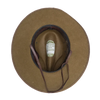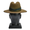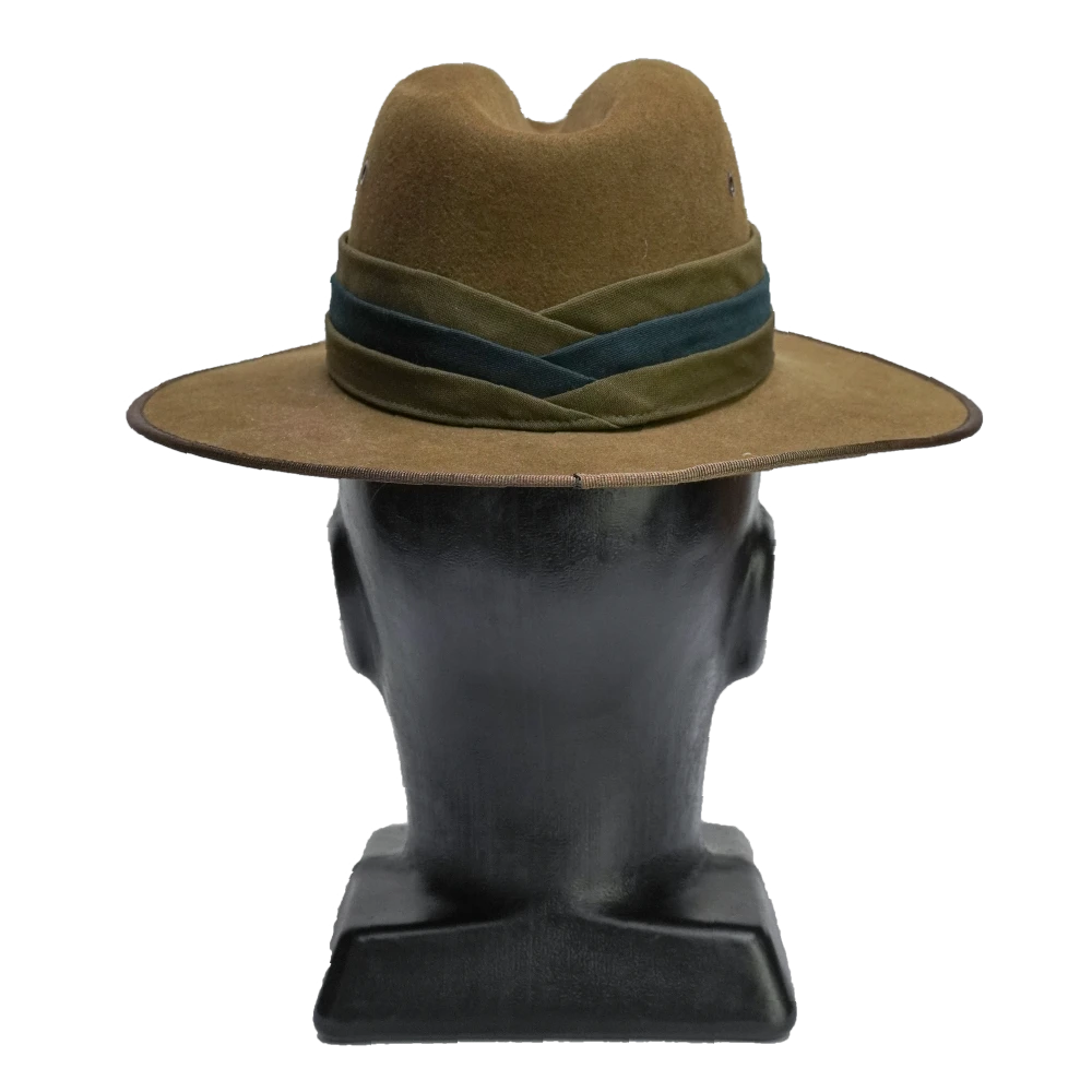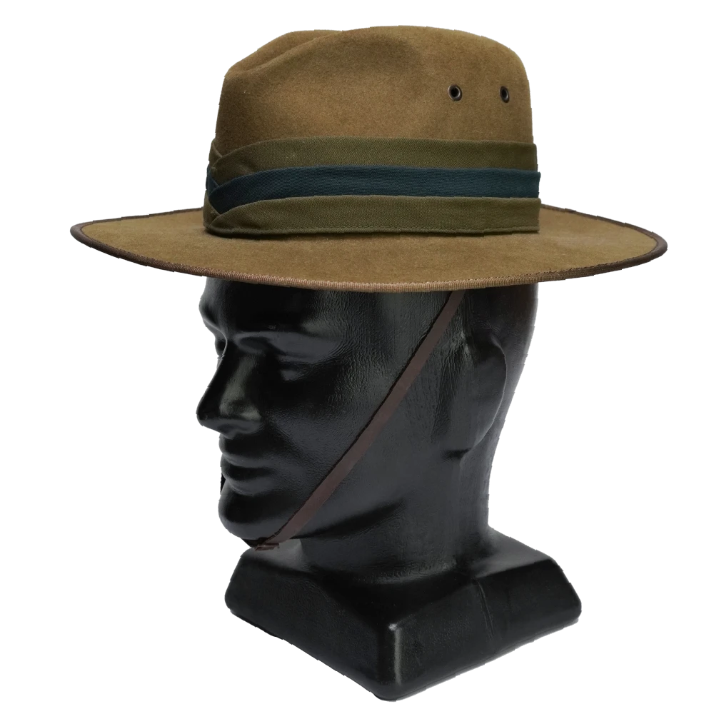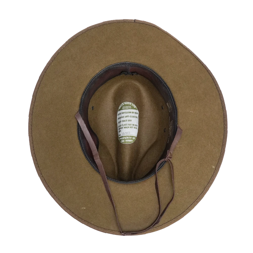 New Zealand Army Mounted Rifles slouch hat. 1990s issue example manufactured by Hills Hats Ltd. Olive drab felt construction with a wide brim and structured crown. Fitted with a matching hat band featuring a darker stripe detail, twin metal ventilation eyelets on the side, and a brown chin strap.