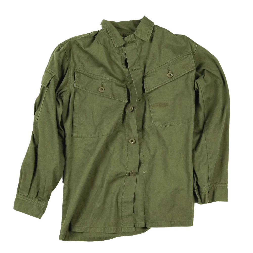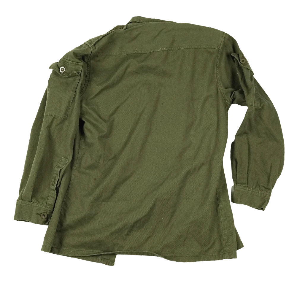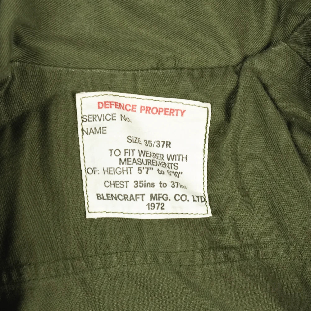 New Zealand Army jungle shirt known as the “Pixie” pattern. Dated 1972. Lightweight construction with a button front closure and chest pockets.