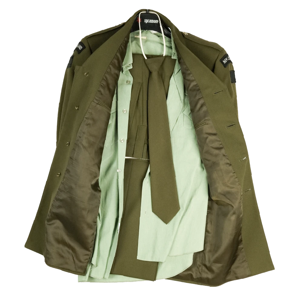 New Zealand Army Territorial Force RNZAC service dress uniform set. This set includes a jacket, shirt, trousers, and tie. Late 2000’s issue.