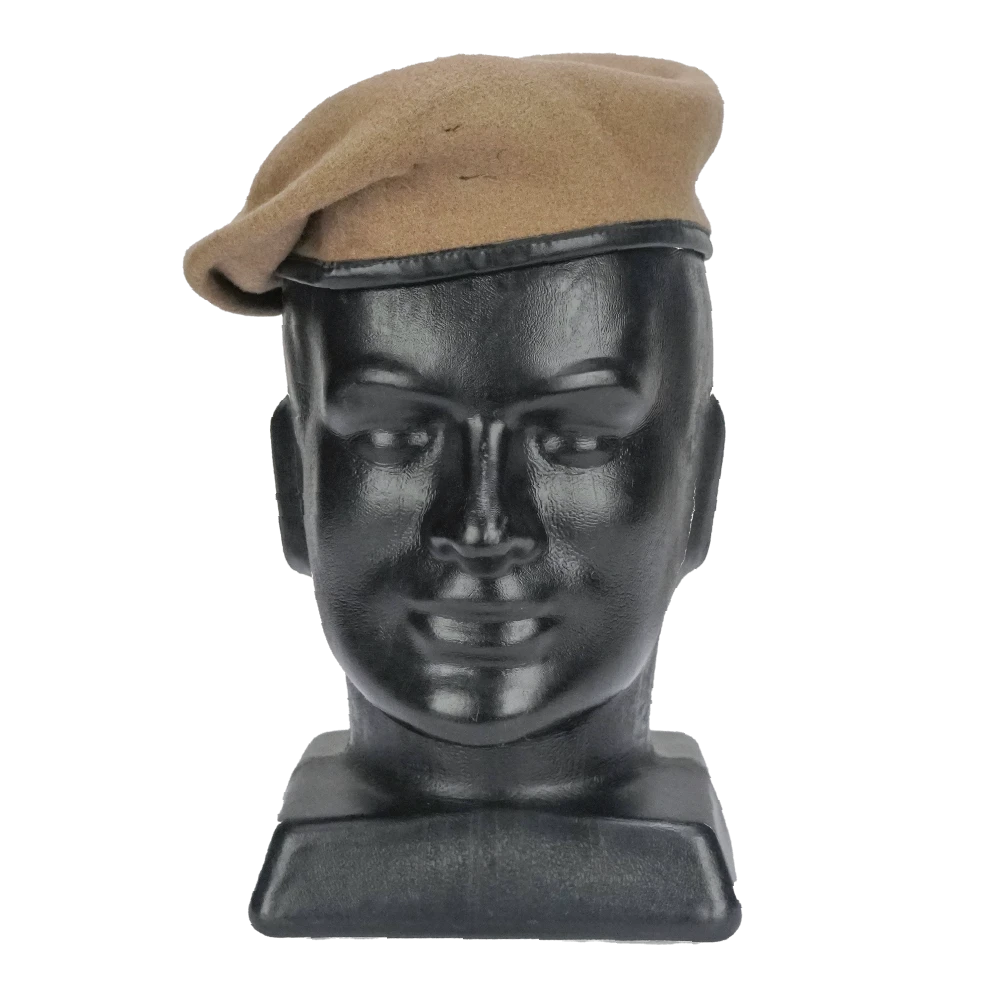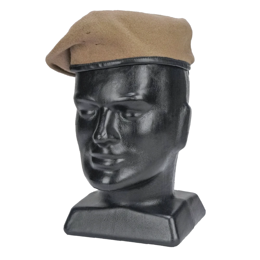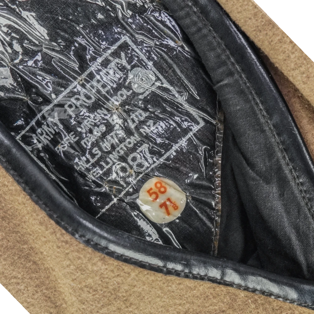 New Zealand Special Air Service beret. This is a tan wool beret with a black leather headband and black internal lining. The interior shows printed maker markings and a clear size label, with “Hills Hats” and a 1987 date visible.