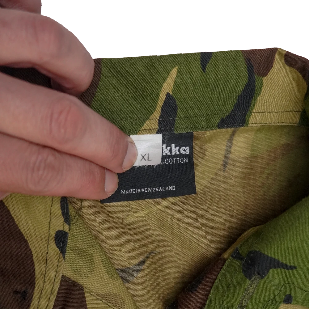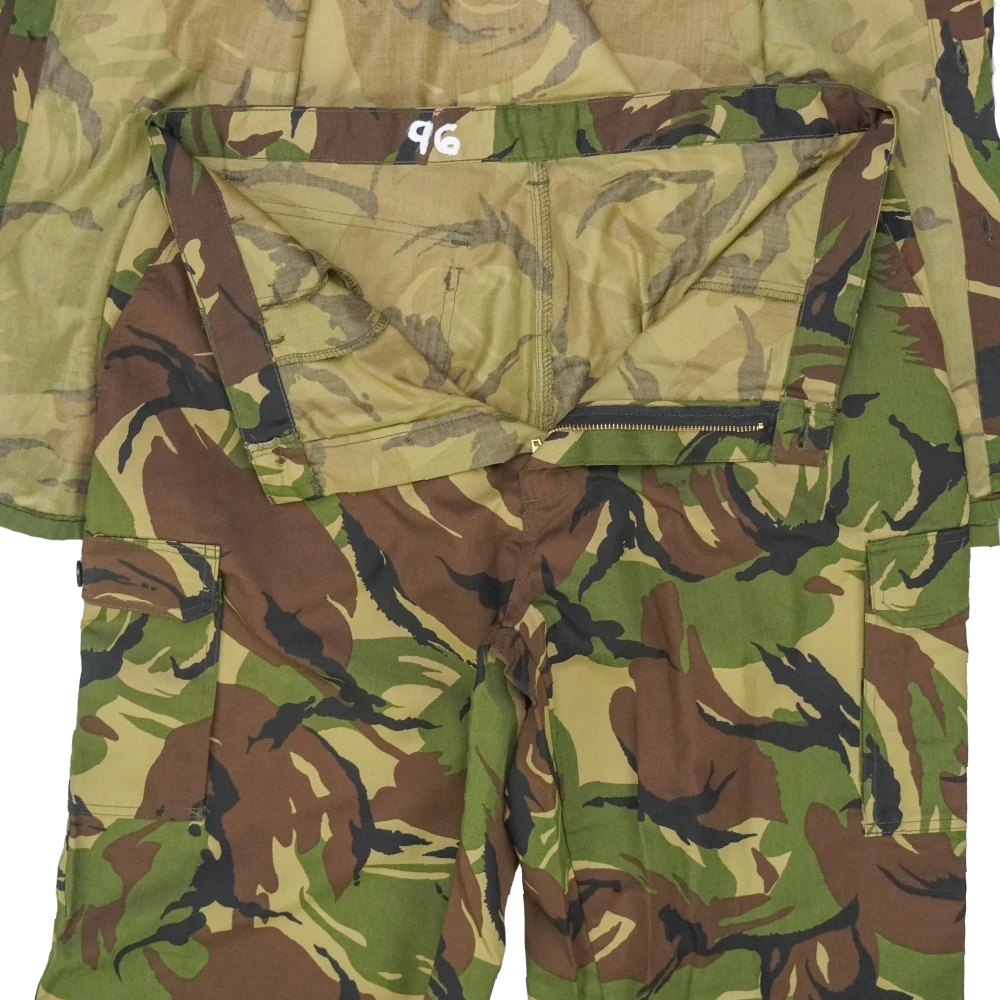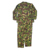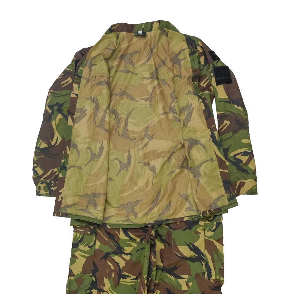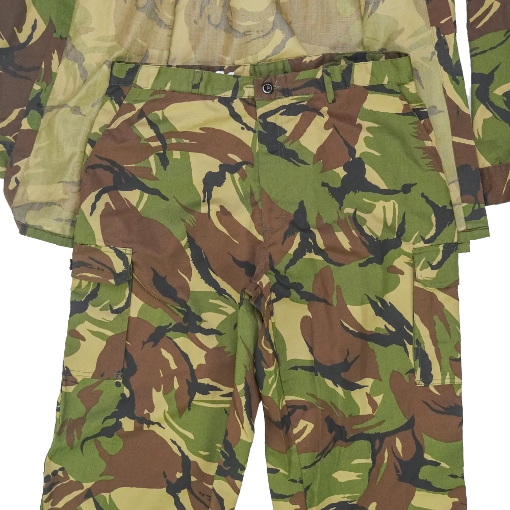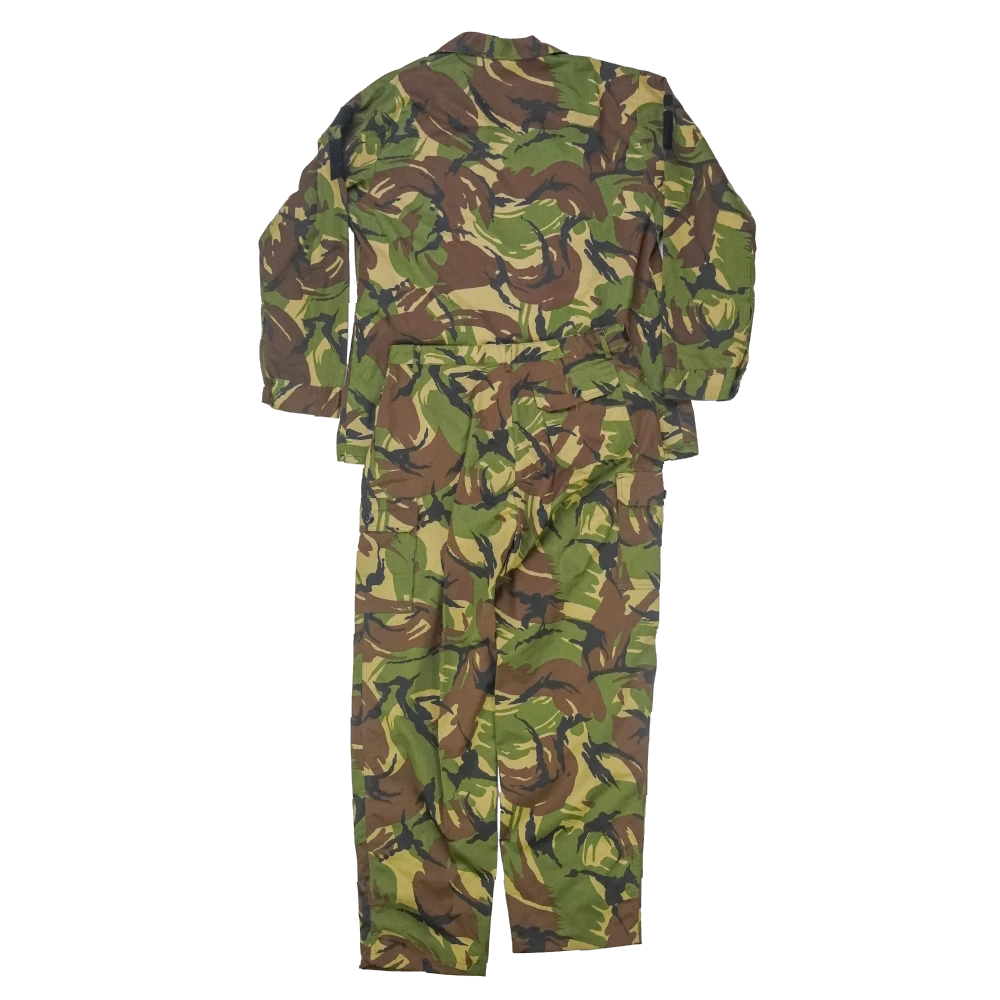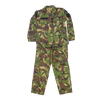 Two-piece NZDF DPM field uniform set consisting of a shirt and trousers. Made in DPM camouflage pattern with standard field construction, including front closure on the shirt and multiple storage pockets across both garments.