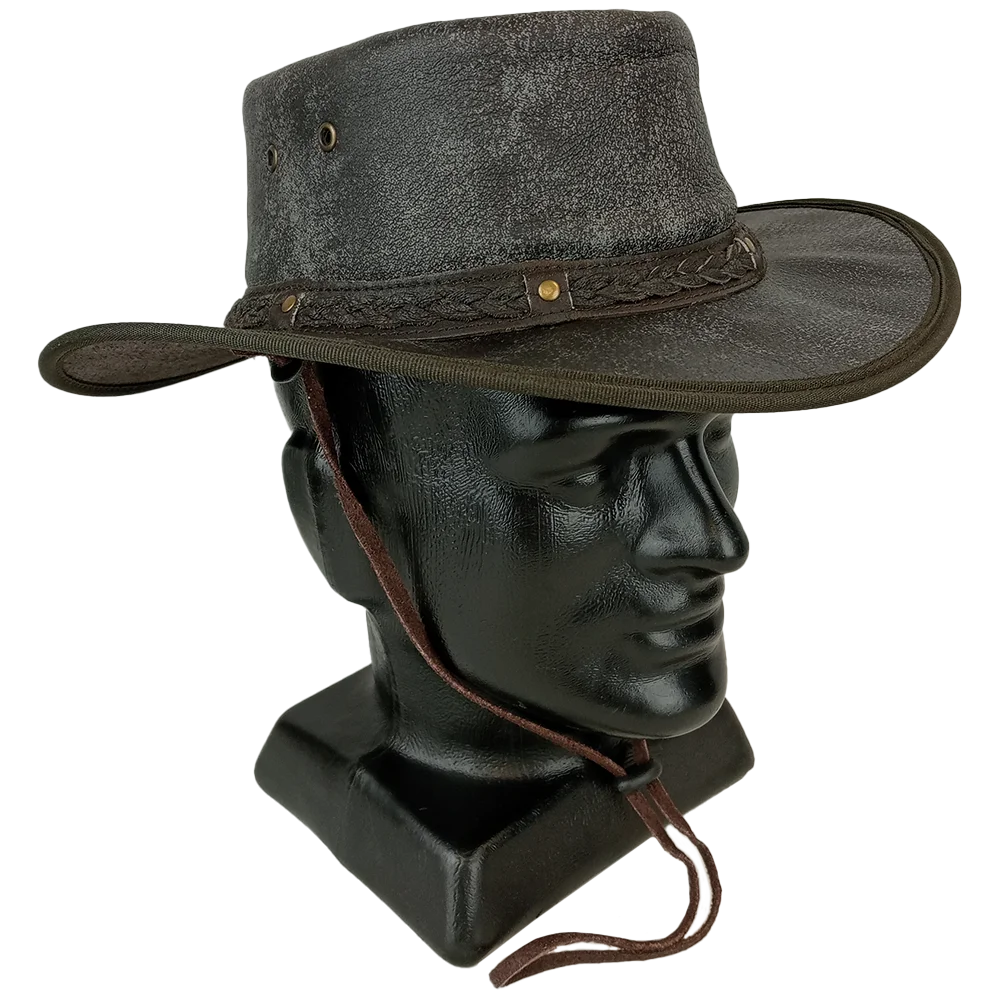 Oi mate! - where are ya going without a hat on?! Outback Trading company make these quality fair dinkum ironbark hats. Real cowhide leather construction for real lads & ladies! A nice big brim keeps the sun out of your eyes as well as having an internal wire for adding desired shape. Eyelets allow your head to breathe (important in the outback!) and has a moisture wicking sweatband to help in this regard also. But what can we say about the main feature - the style of these is what sells themselves!