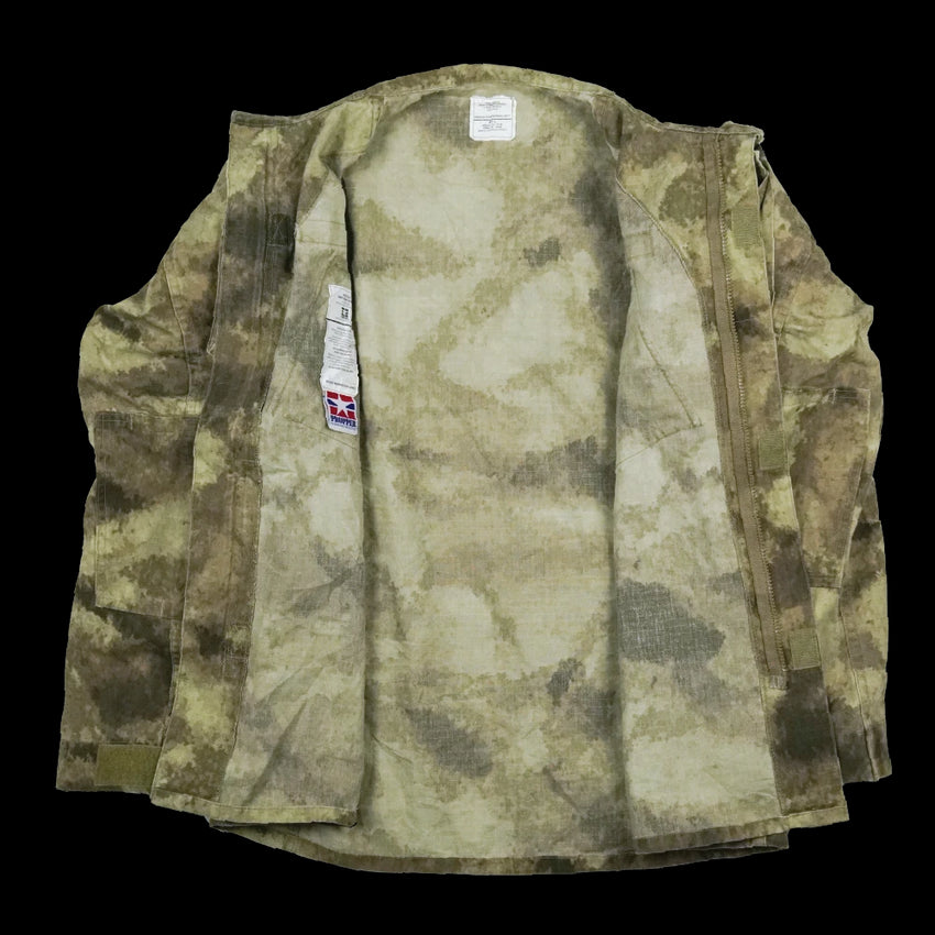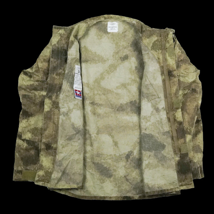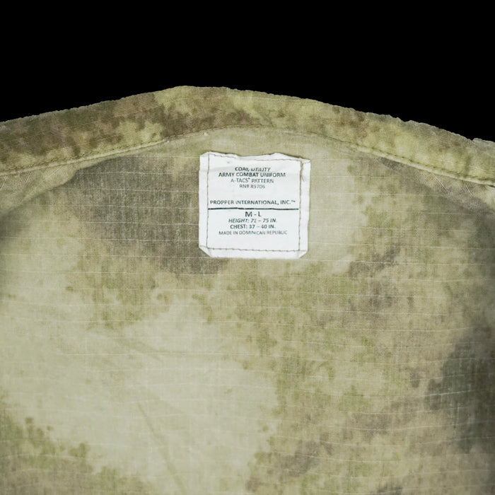 Commercial Propper ACU-style field shirt in A-TACS AU camouflage. Constructed with a ripstop fabric and a mandarin collar, with angled chest pockets and sleeve pockets designed for patch placement.