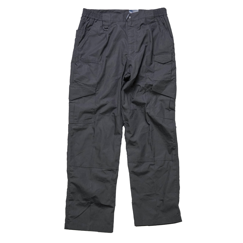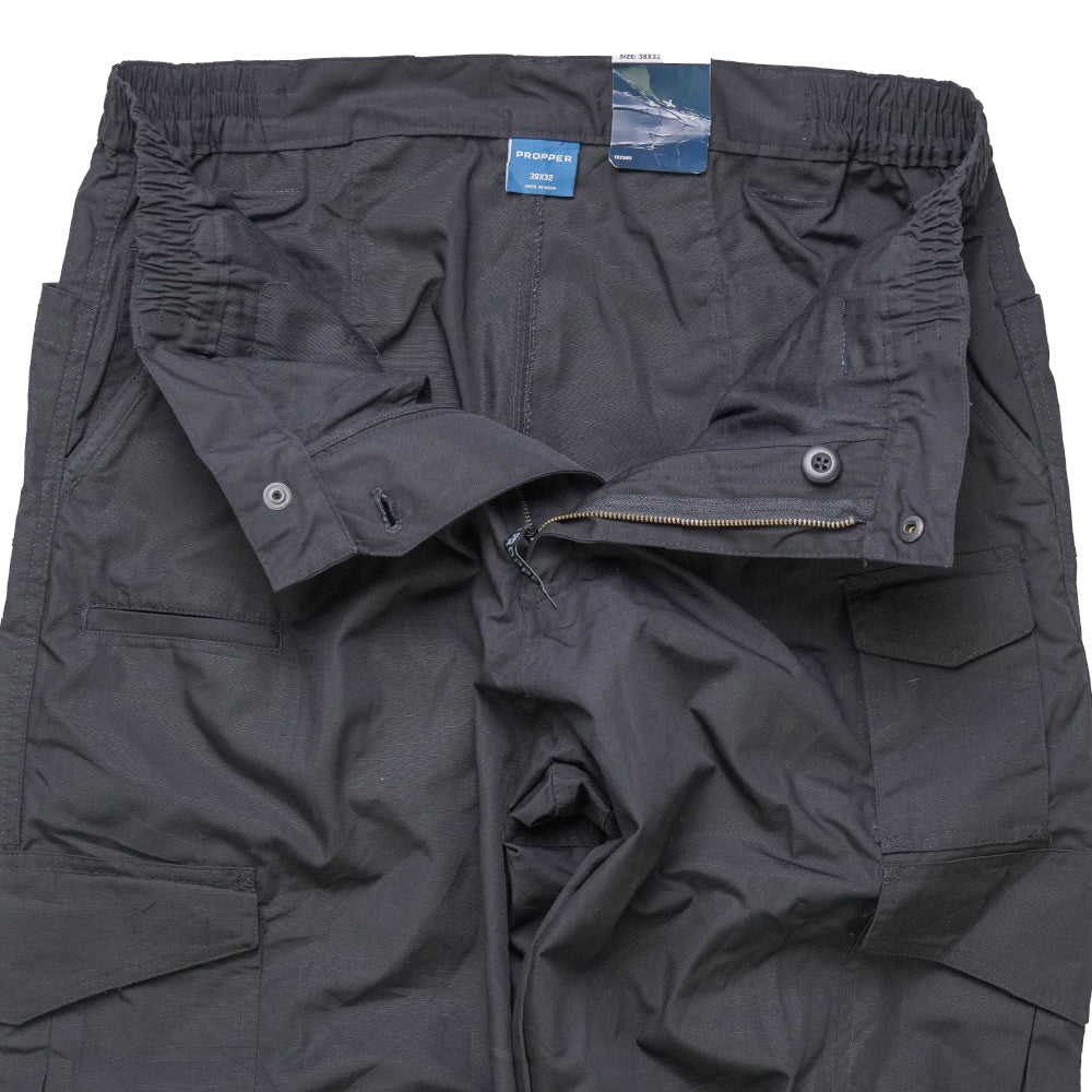 Propper black tactical trousers in 38x32 sizing. Commercial production with a zip fly and button closure, belt loops, and elasticated sections at the waistband. The design includes multiple cargo pockets on the legs with flap closures, along with front and rear pockets. New condition with original tags attached.
