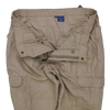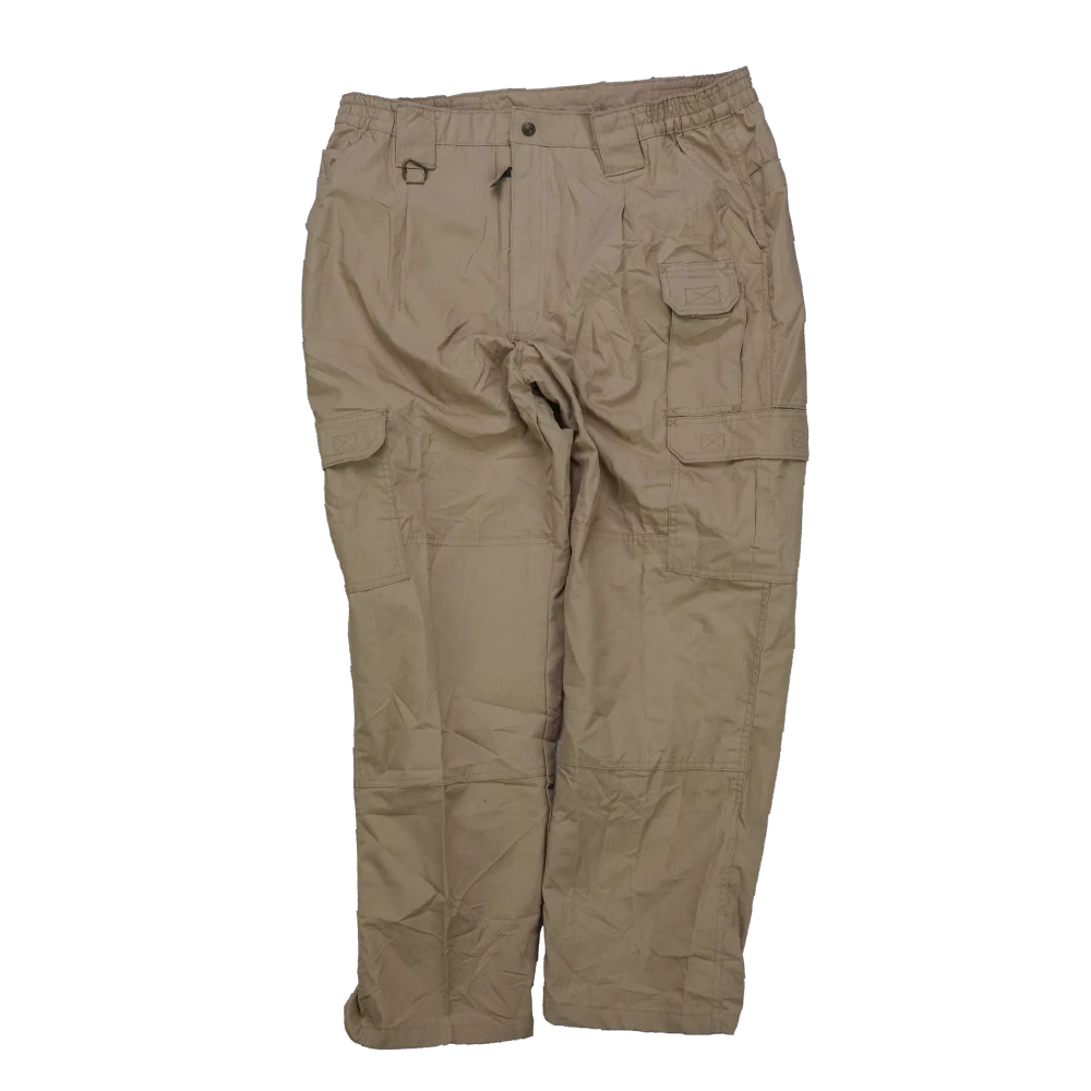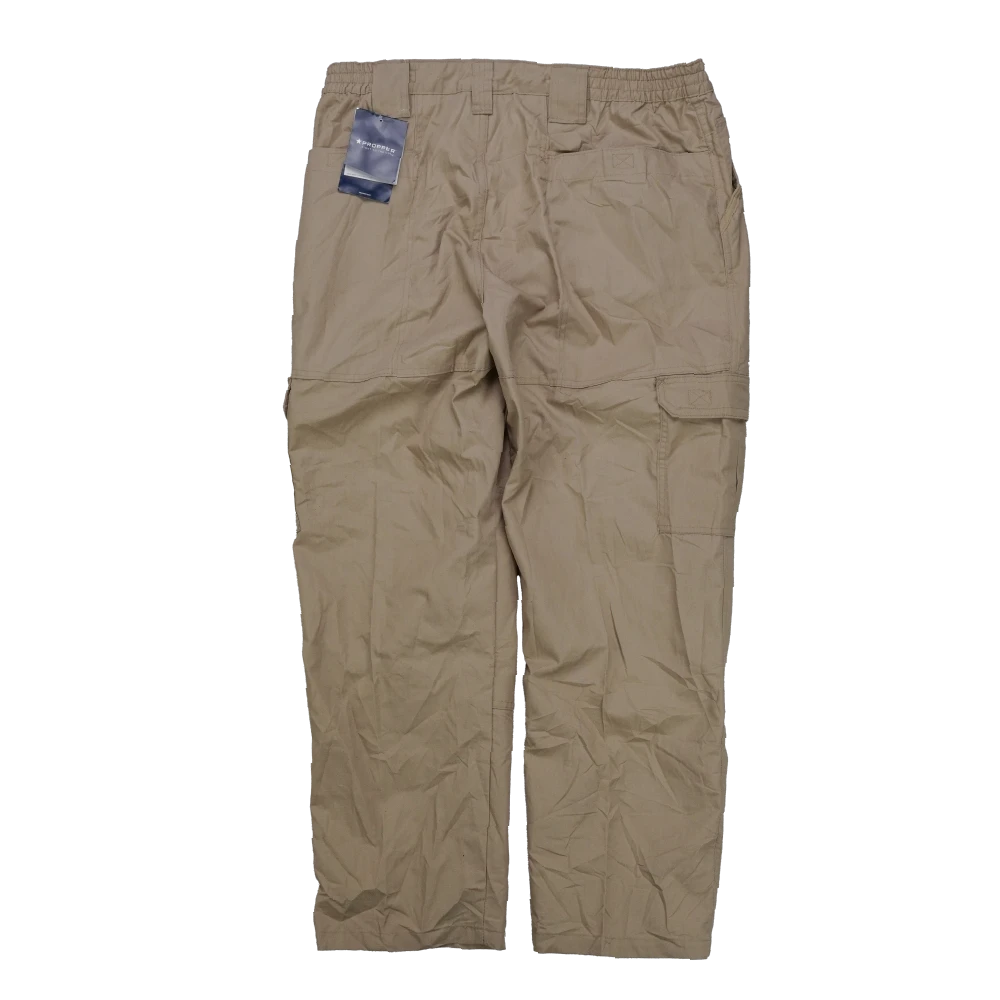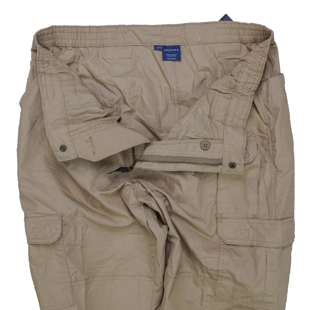 Propper khaki lightweight trousers with an elasticated waistband and belt loops. Zip fly with button closure. Multiple cargo-style leg pockets with flap closures, plus front hand pockets and rear pockets. Straight-leg cut.
