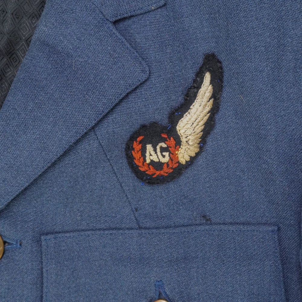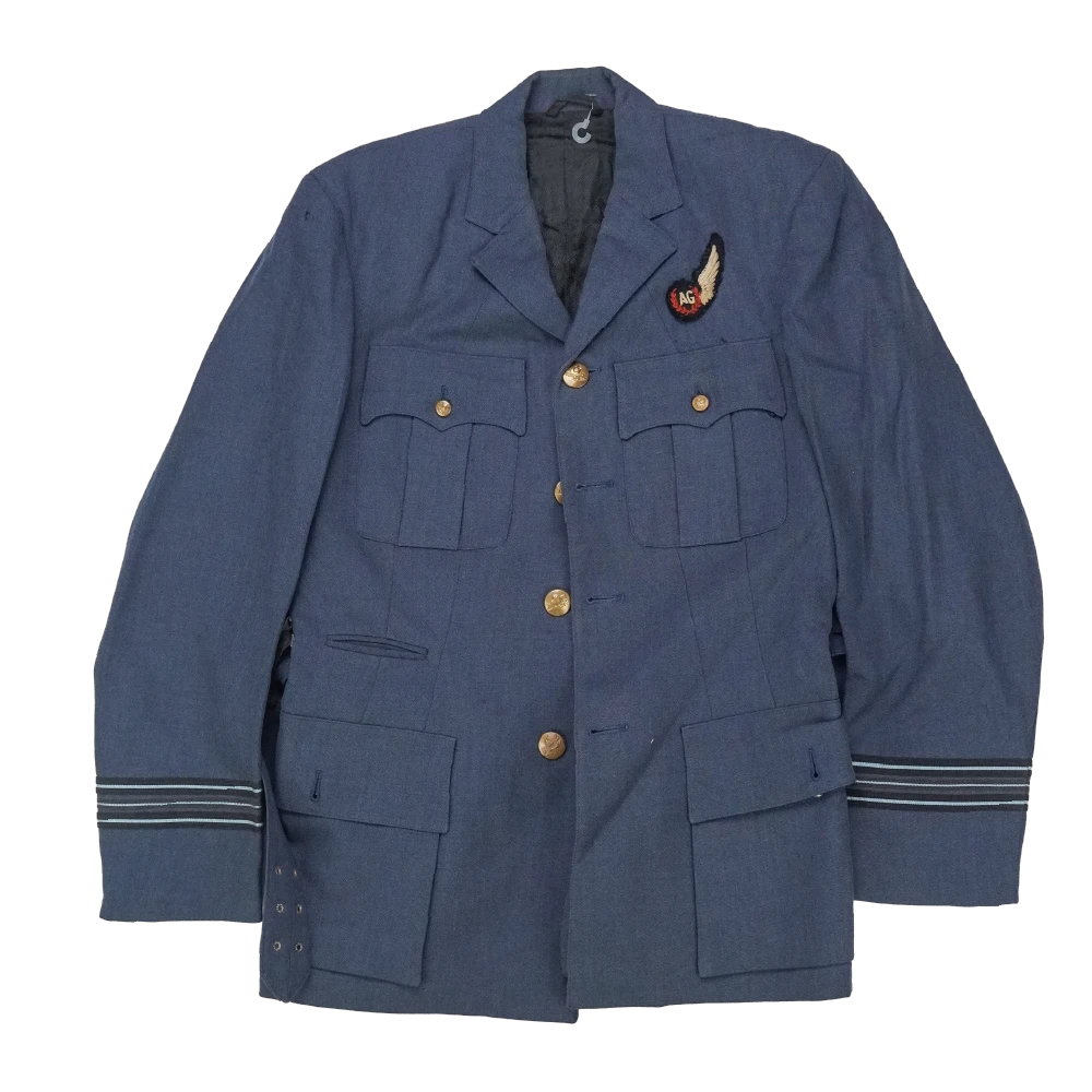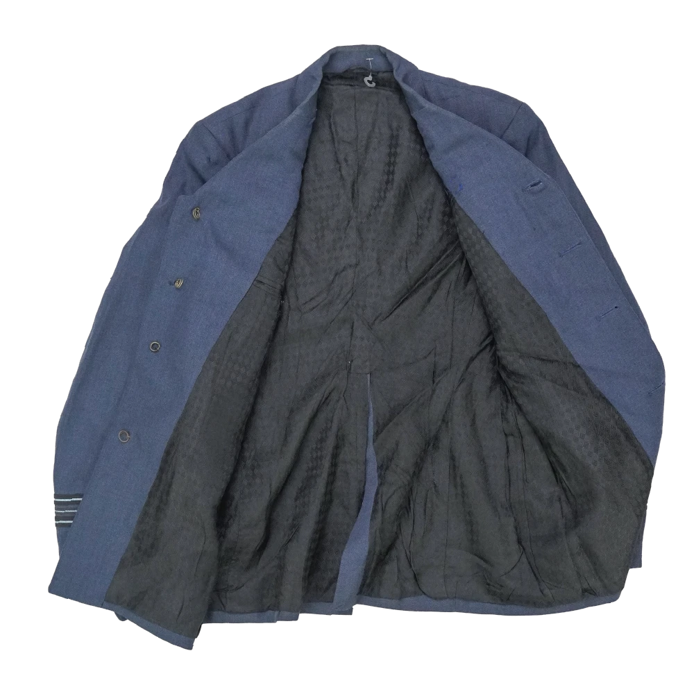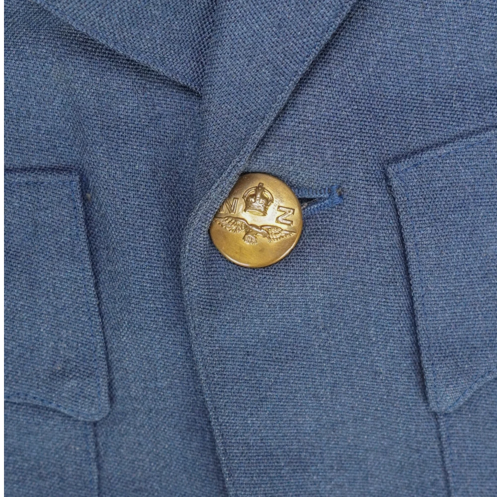 RNZAF service dress jacket in large size. Blue dress jacket with a structured cut, brass RNZ buttons, and multiple front pockets including two chest pockets and two lower pockets with flaps. Features rank-style sleeve stripes, an attached waist belt with metal buckle, and a dark patterned inner lining. An embroidered wing-style patch is present on the chest.
