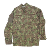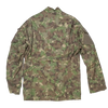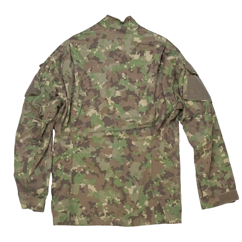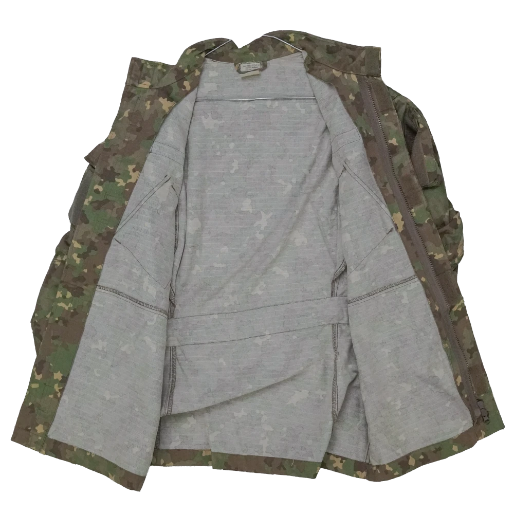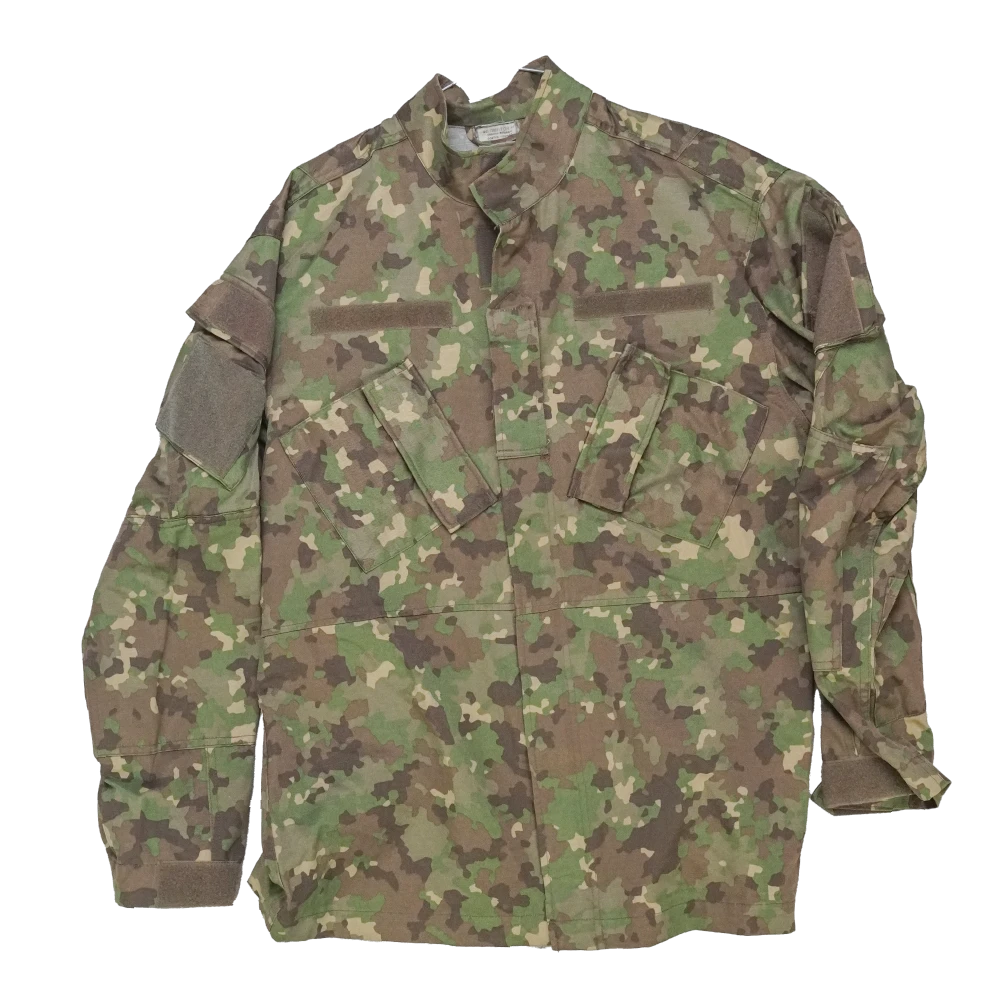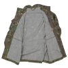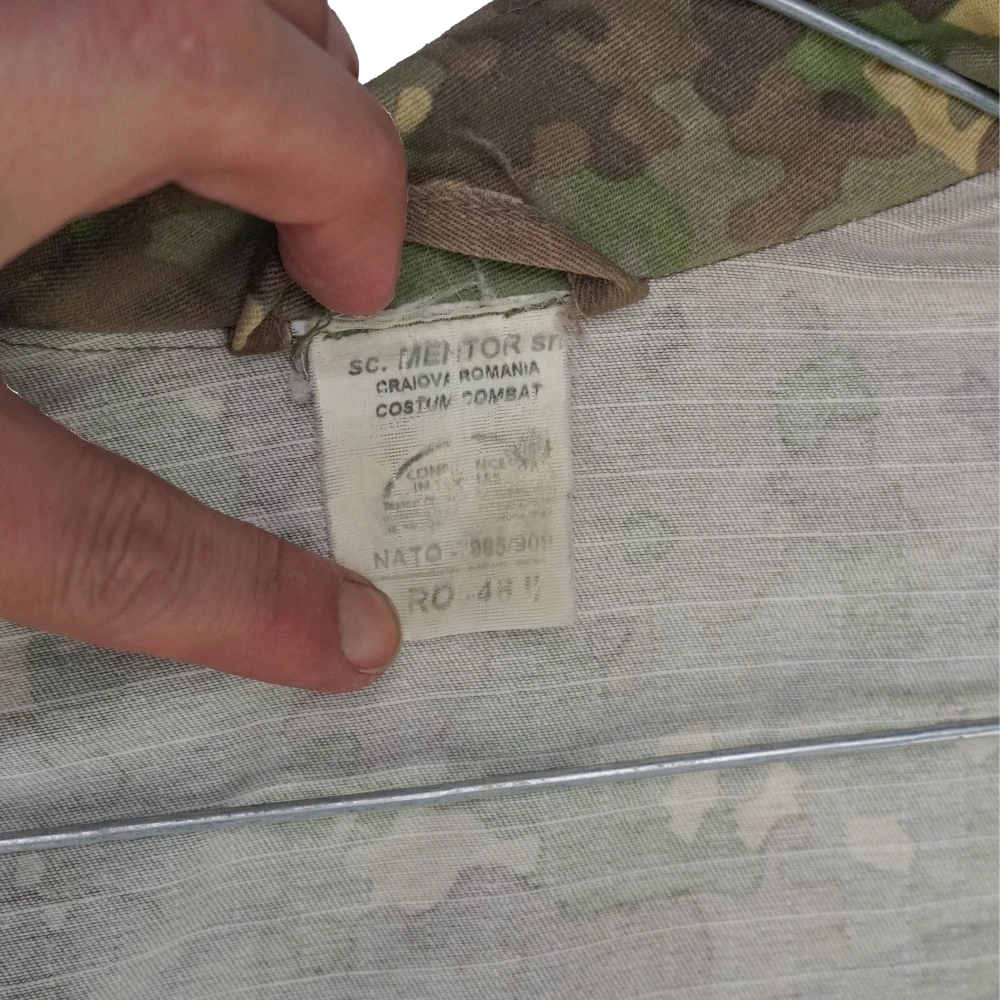 Romanian Army M2017 field shirt in a green and brown camouflage pattern. Features a zip-front closure with a high collar, multiple front chest pockets, and sleeve pockets with hook-and-loop panels. The interior shows a lighter fabric lining with visible seam construction and reinforced panel sections.
