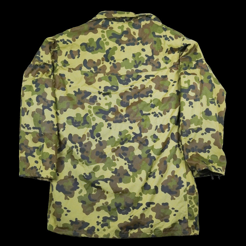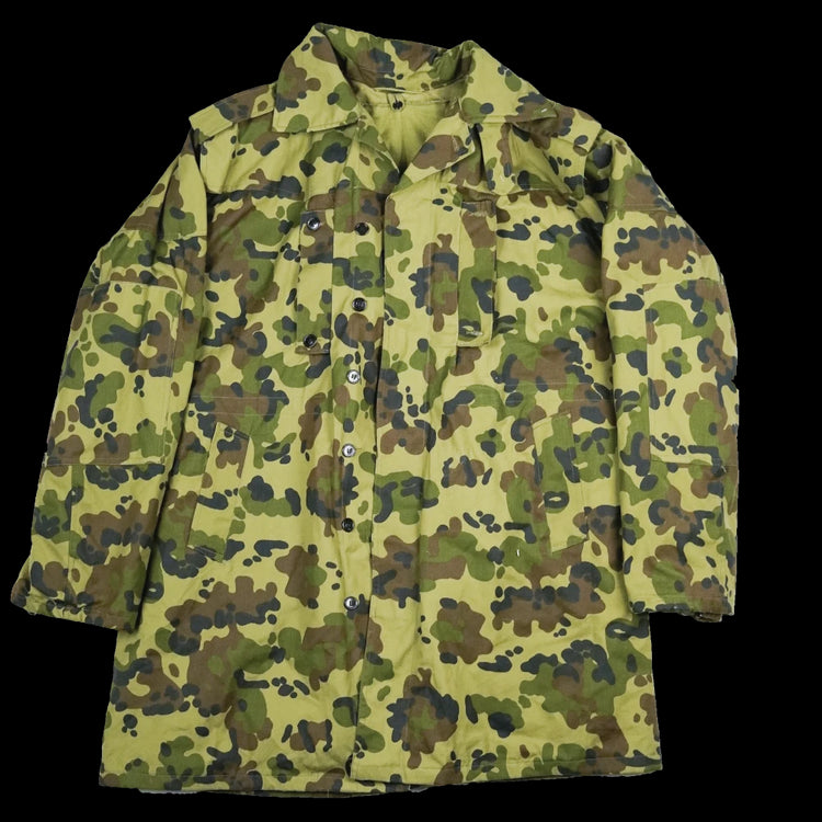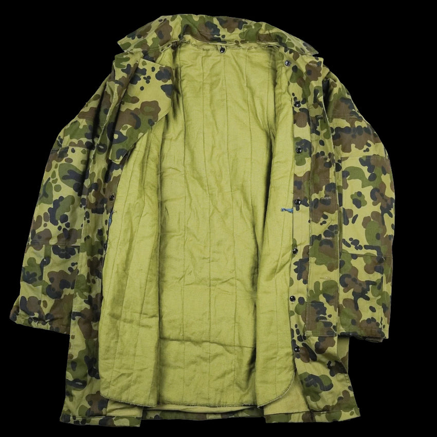 Romanian Army M93 parka supplied with a removable inner liner. Features a full-length buttoned front with storm flap and an integrated hood that folds into the collar. Waist and hem cord adjustments are present.
