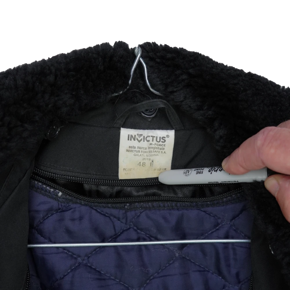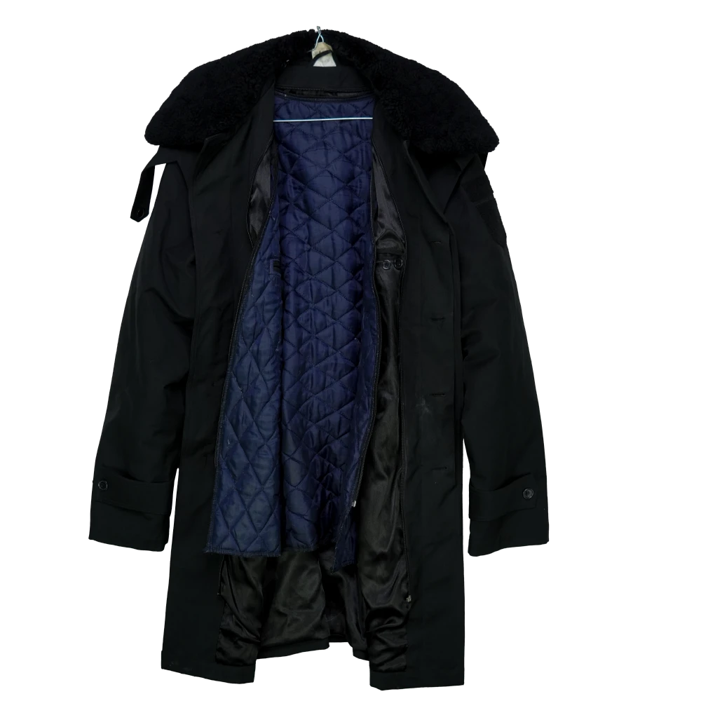 Romanian Naval Academy surplus parka in black. Features a front zip closure and removable liner.