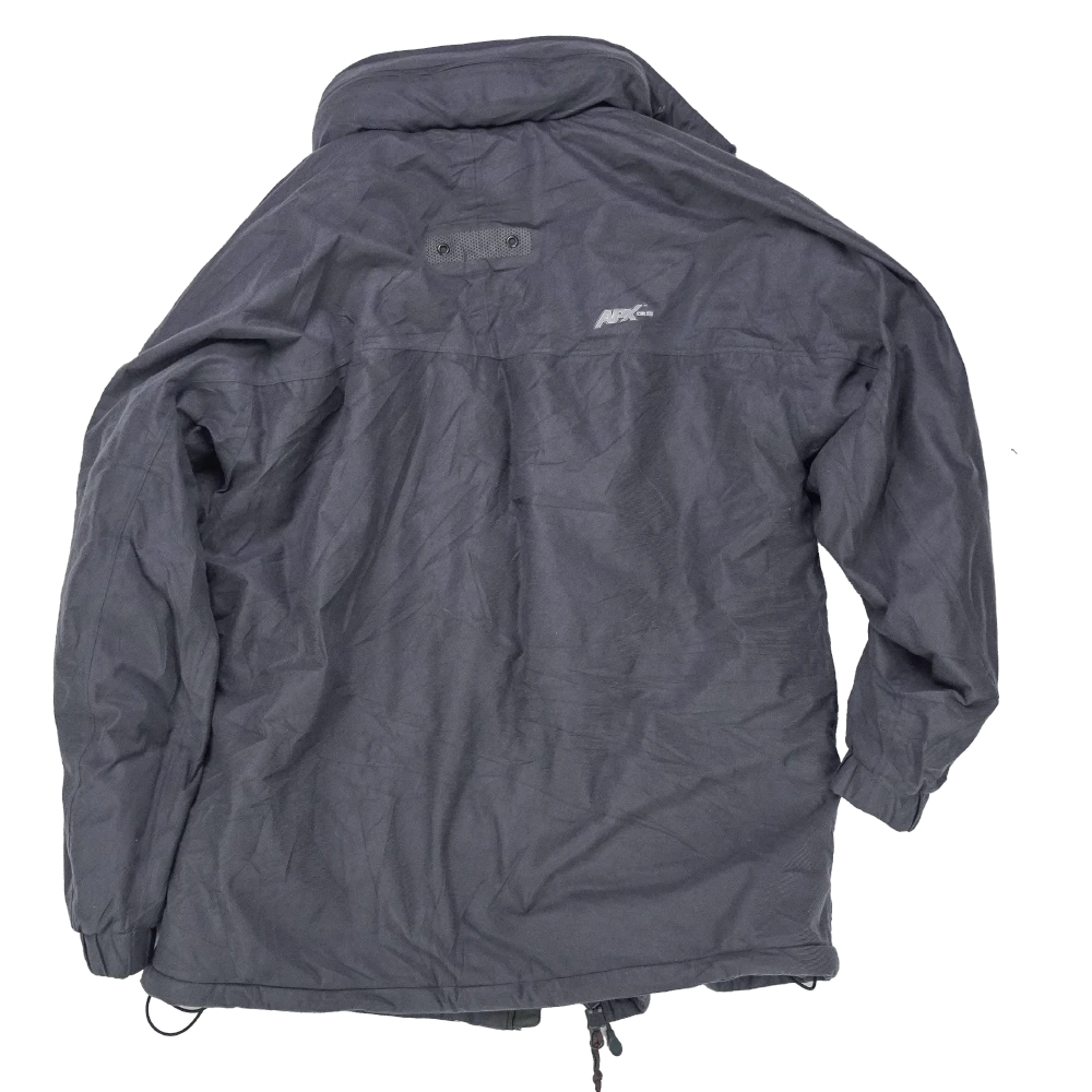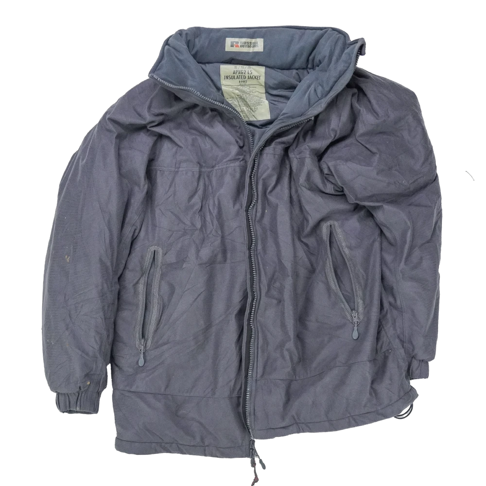 Russell Outdoors APX L5 insulated jacket in XLarge. Features a full zip front with a high collar, synthetic insulated lining, and a plain outer shell with a slightly crinkled finish. Includes two zippered hand pockets and elasticated cuffs, with a drawcord adjustment at the hem.