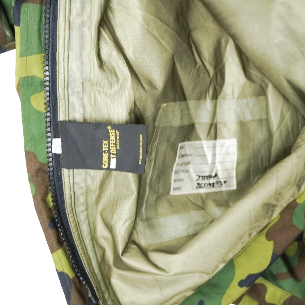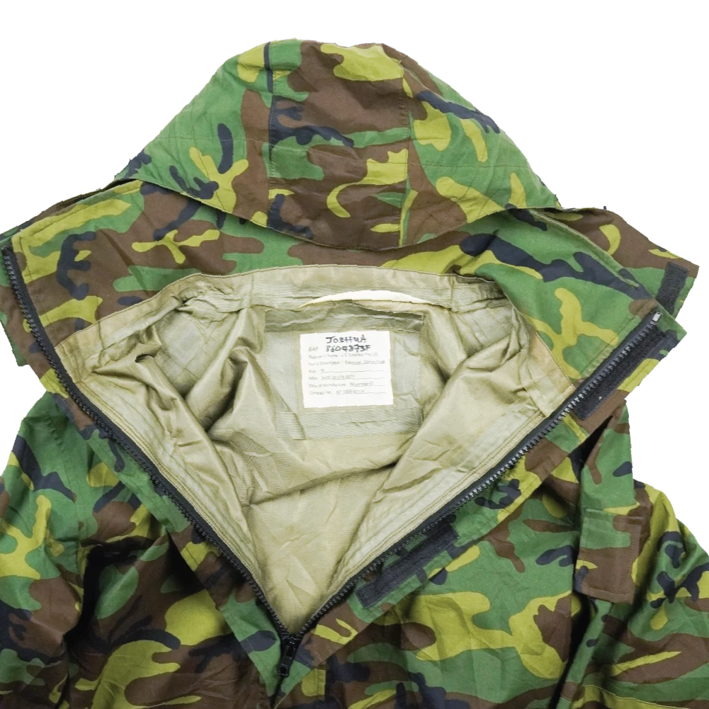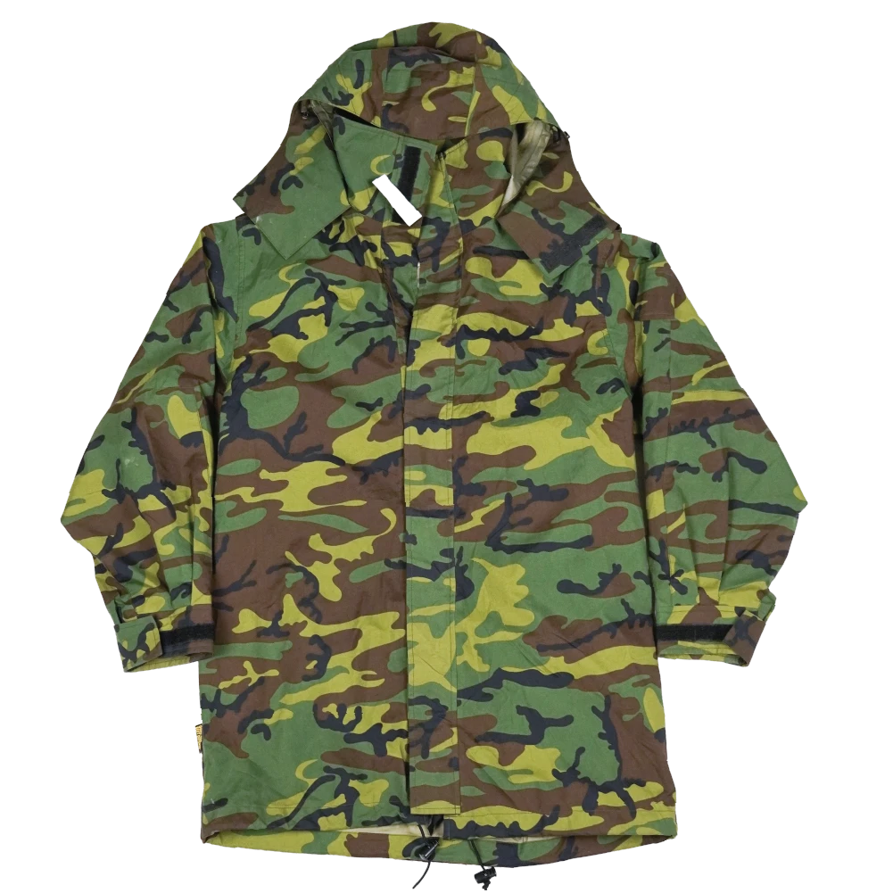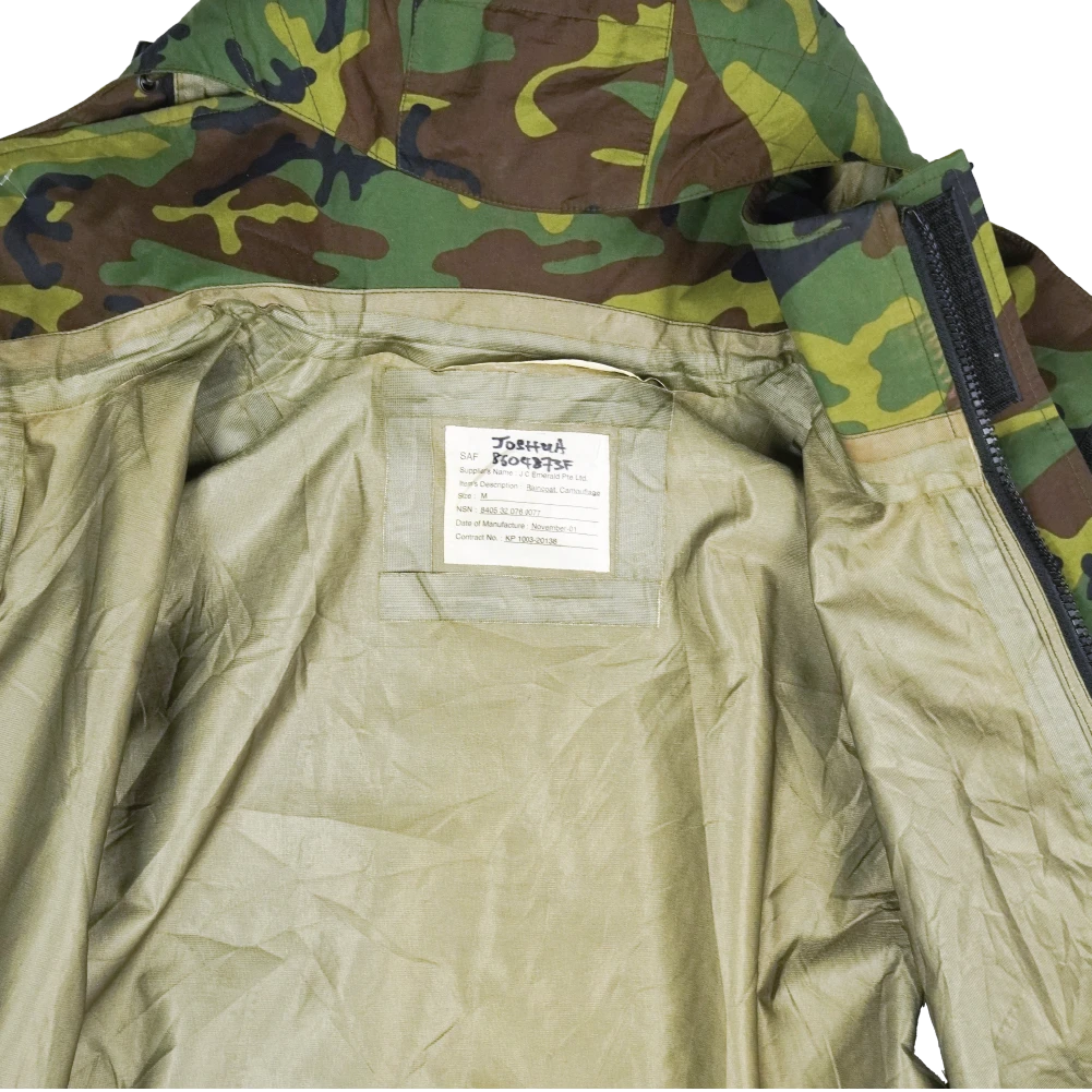 Surplus Singaporean camouflage Gore-Tex jacket. Waterproof shell construction with seam-taped panels and a zip front closure.