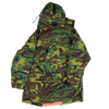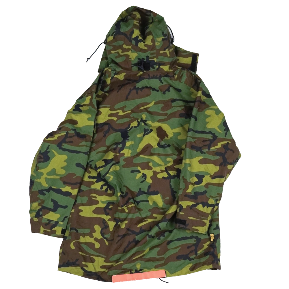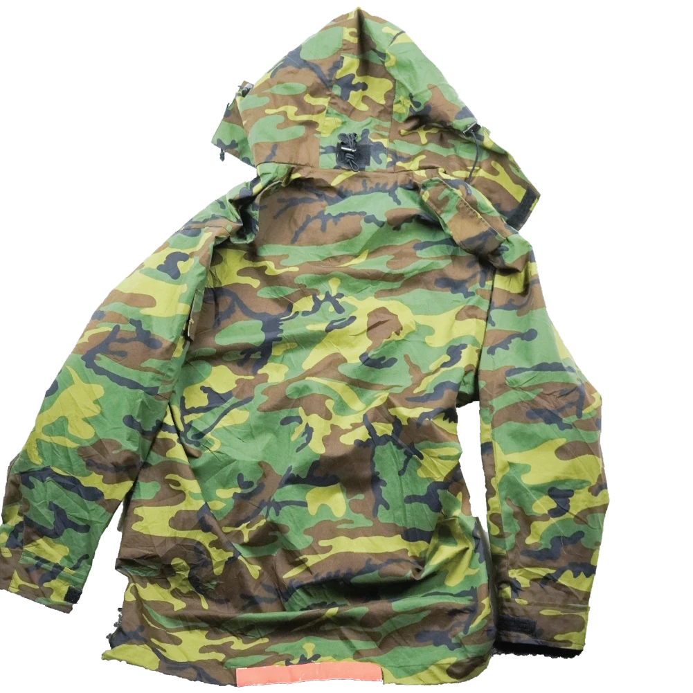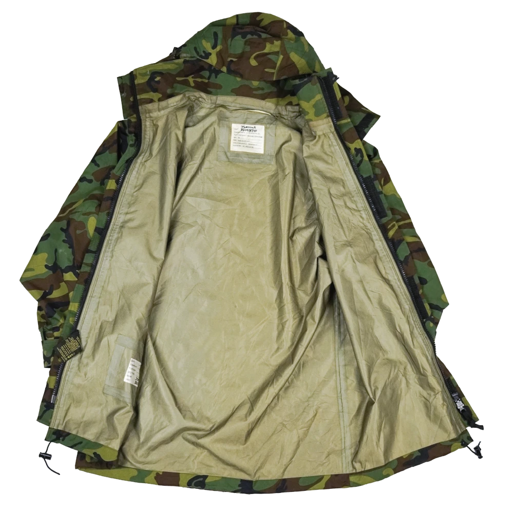 Surplus Singaporean camouflage Gore-Tex jacket. Waterproof shell construction with seam-taped panels and a zip front closure.
