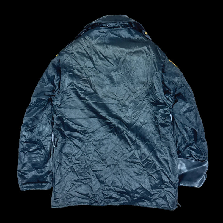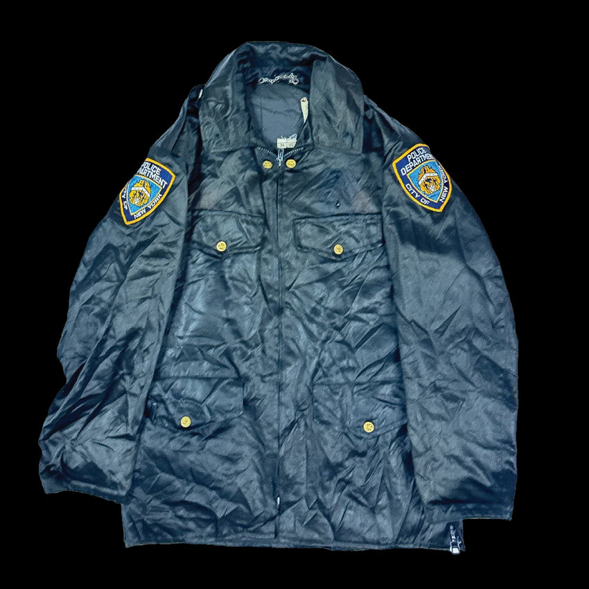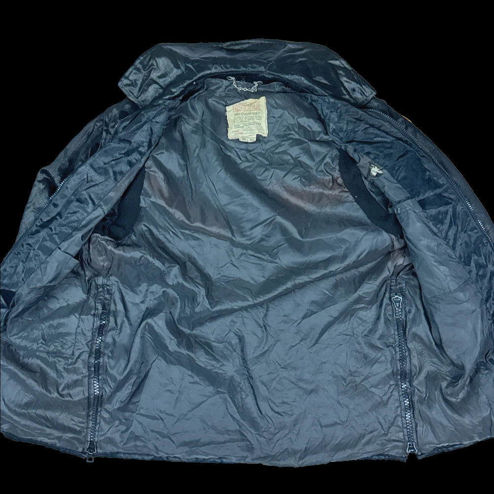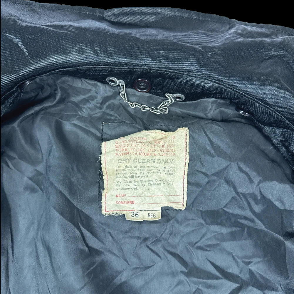Surplus NYPD police duty jacket from the 1980s. Features a duty-style outer with multiple pockets and access zips at the lower waist. There is light staining present on the lining.