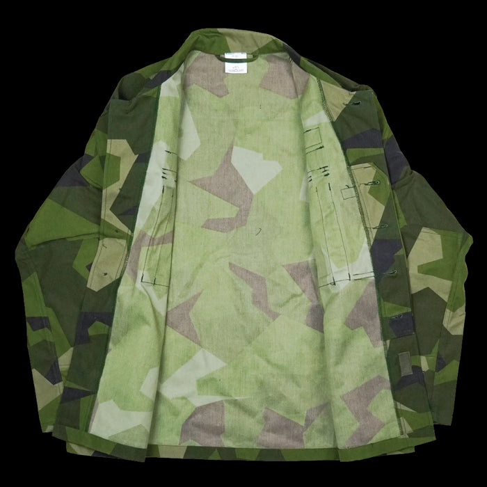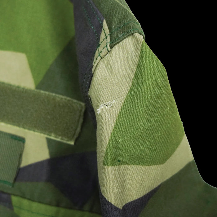 Swedish M90 camouflage field shirt in surplus issue configuration. The shirt features reinforced elbow areas, a shrouded button-up front, and hook and loop chest pockets. Hook and loop panels are present on the upper right arm and left chest, with adjustable cuffs.