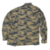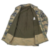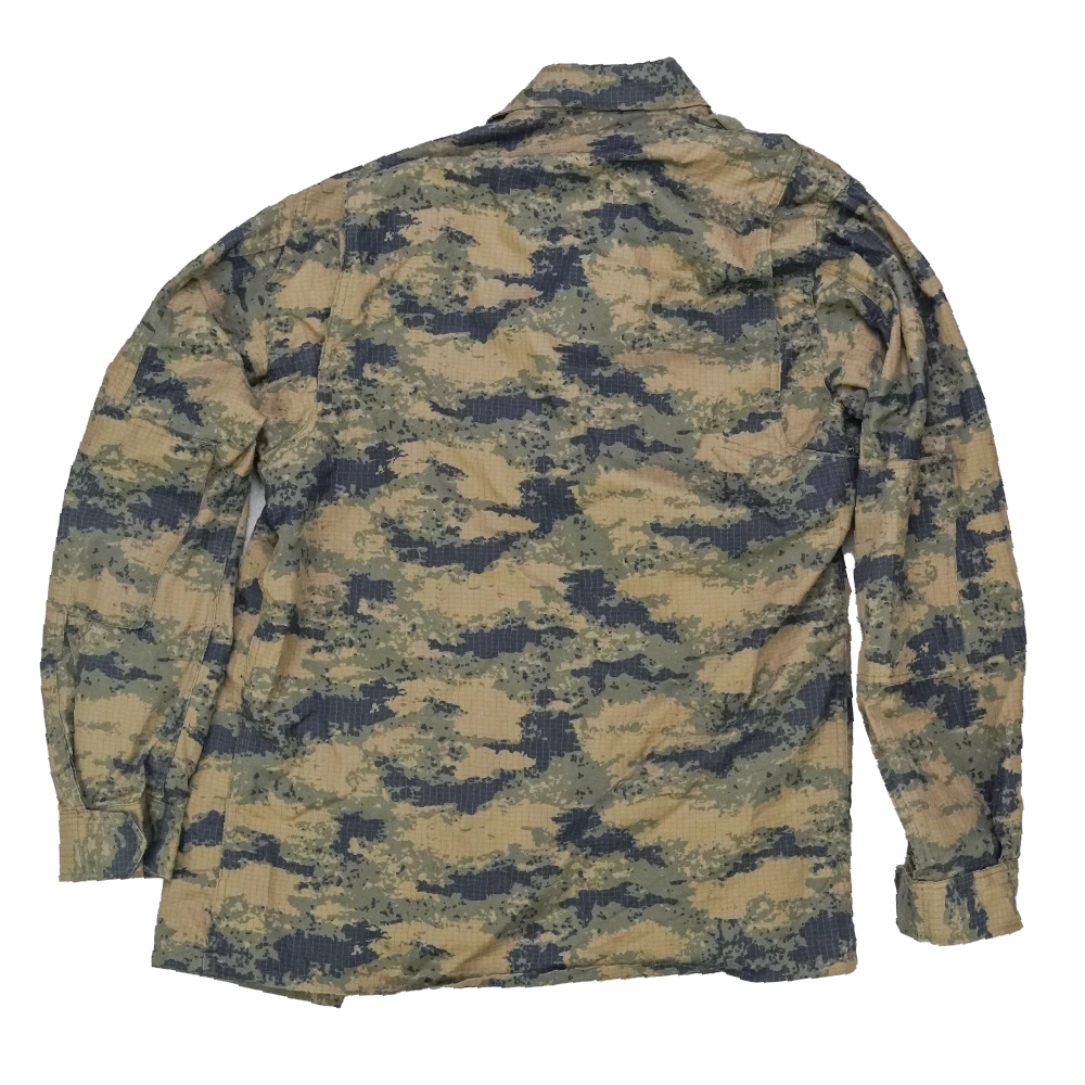 Turkish Air Force lined camouflage field jacket. This is a medium regular jacket with a full front closure, multiple front pockets, and a lined construction. Shoulder epaulettes have been removed.