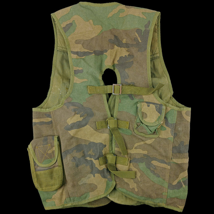 The front of the vest features multiple integrated pouches designed for G3 or similar rifle magazines, with additional utility compartments for gear, tools, or grenades. In a appealing M81 woodland clone camouflage, we might add.