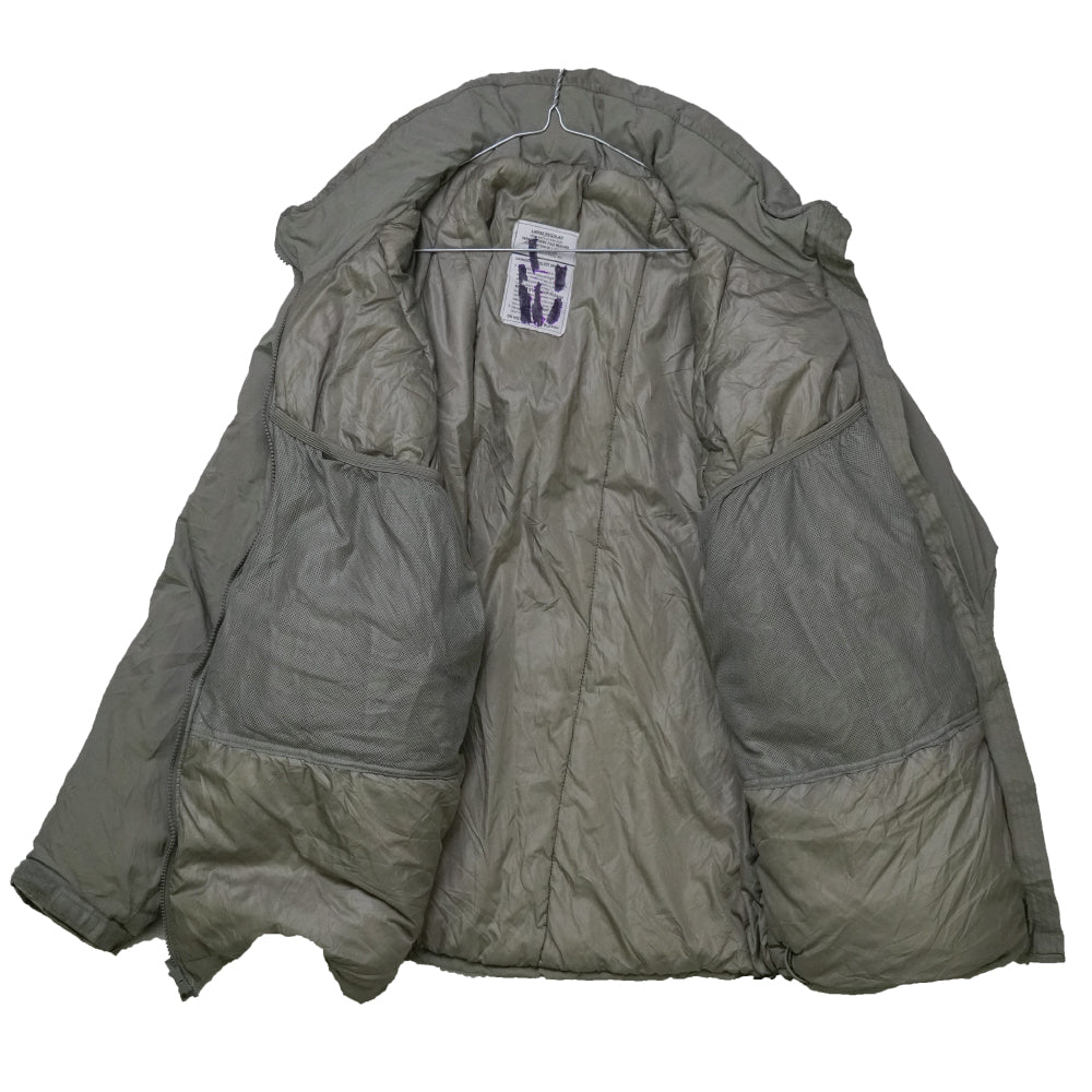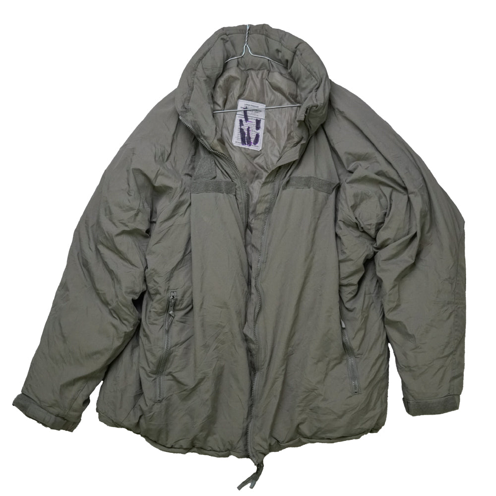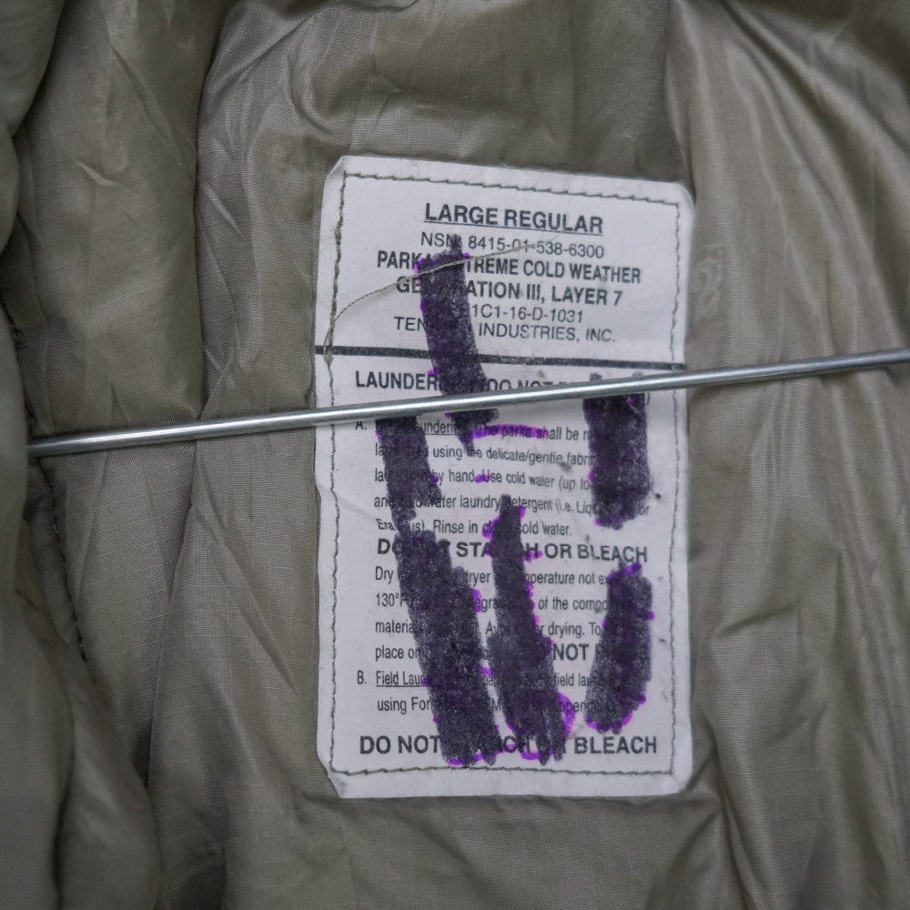 U.S. Army Gen III ECWCS Level 7 extreme cold weather parka in military specification. Features a lightweight insulated construction with wind- and water-resistant shell and a hooded design. Tagged Large Regular.