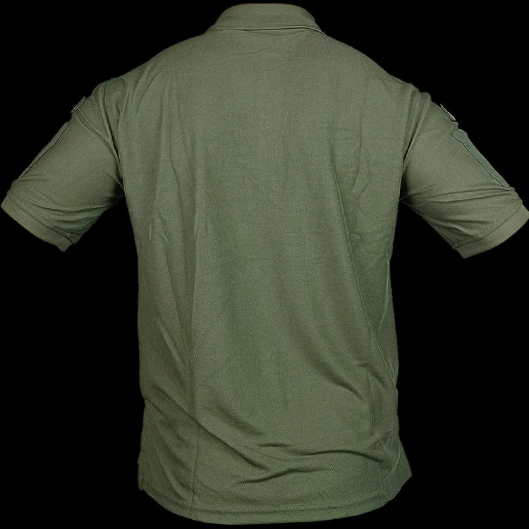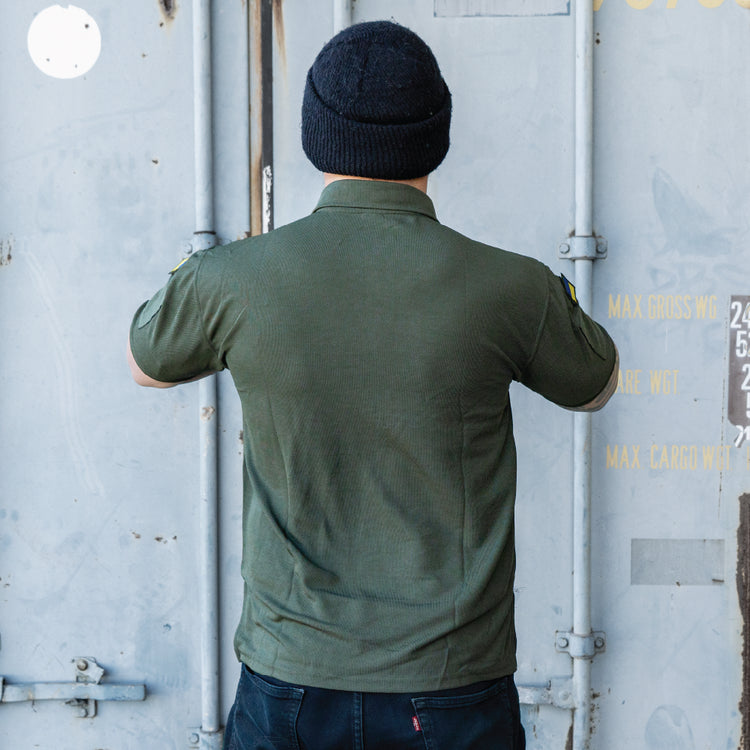 Olive drab Ukrainian Army short-sleeve polo shirt. Constructed from durable, breathable fabric, it combines comfort with a smart, professional look. Worn by service members for training and casual duty, it reflects national pride and military identity in a versatile design. Some might have national flag patches on each sleeve.