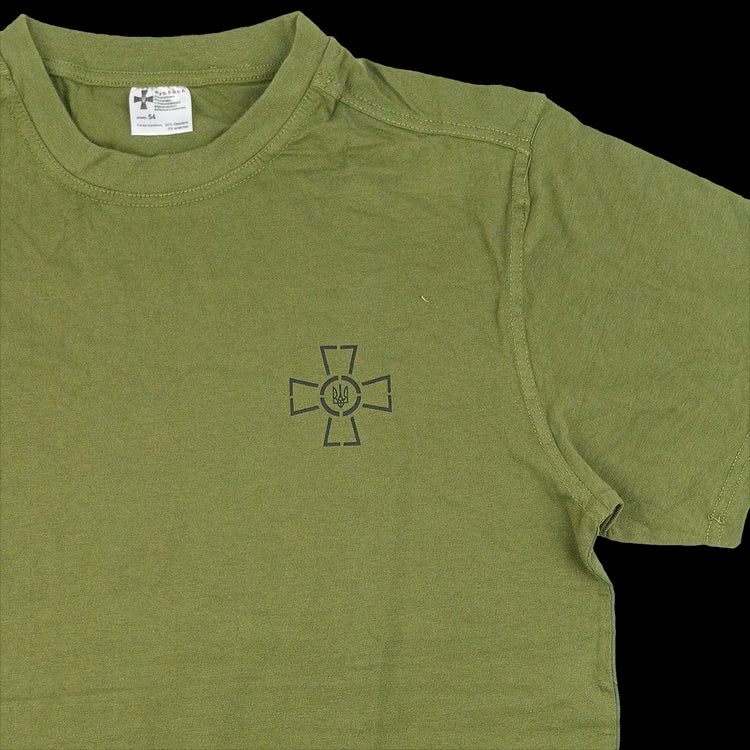 Ukrainian Army green short-sleeve T-shirt featuring the national emblem proudly displayed on the chest. Made from durable cotton blend for comfort and breathability, it’s designed for both field and casual wear. A practical piece symbolizing service, resilience, and patriotism, commonly issued to Ukrainian armed forces personnel.