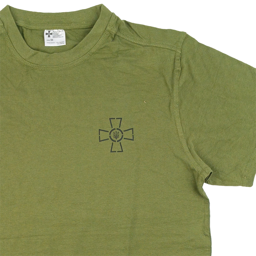 Ukrainian Army green short-sleeve T-shirt featuring the national emblem proudly displayed on the chest. Made from durable cotton blend for comfort and breathability, it’s designed for both field and casual wear. A practical piece symbolising service, resilience, and patriotism, commonly issued to Ukrainian armed forces personnel.