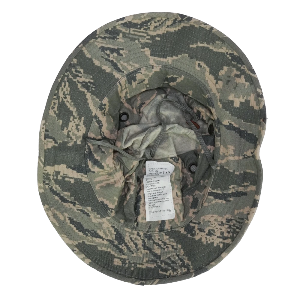 US Air Force ABU boonie hat in Size 7 1/4. Features the ABU camouflage pattern and a wide brim for coverage.