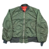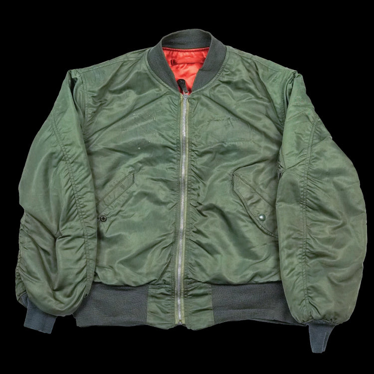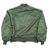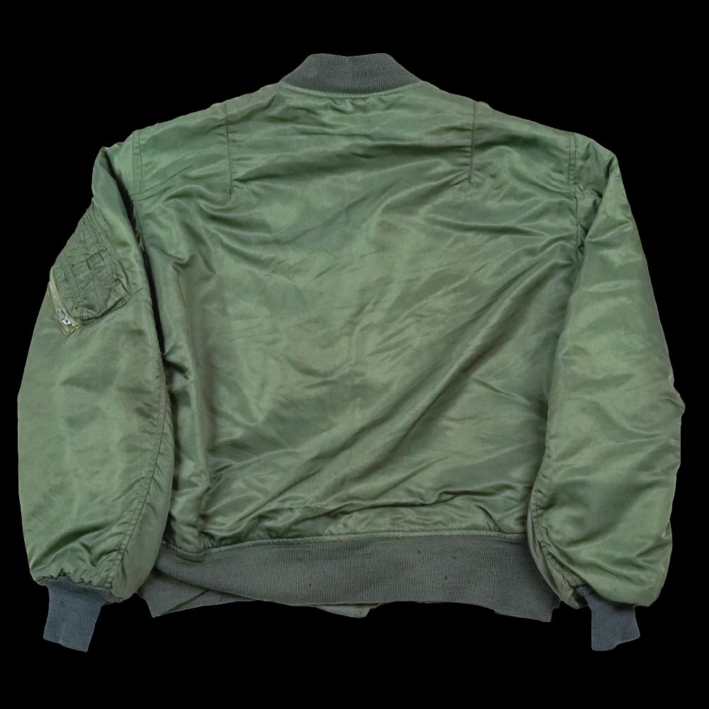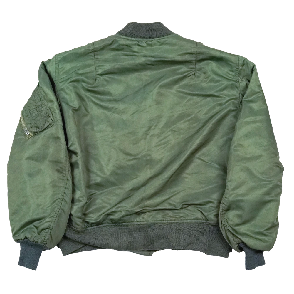 US Air Force L-2B flight jacket manufactured by Alpha Industries. Nylon and polyester construction with elasticated collar, cuffs, and waist, and a utility/pen pocket on the left sleeve.