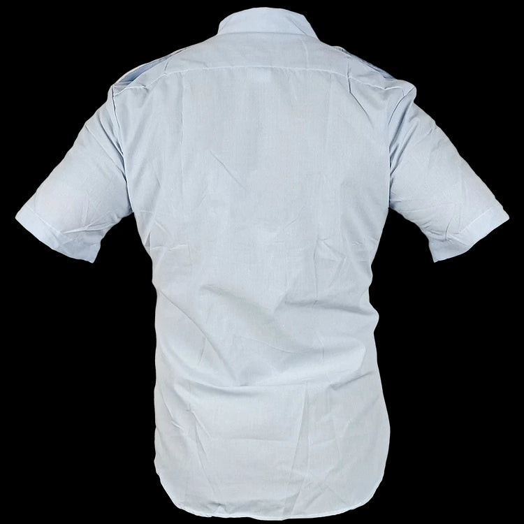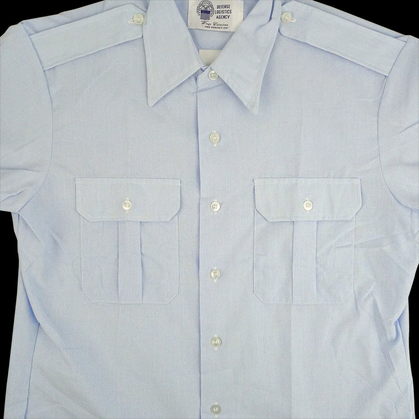 This US Air Force Blue dress shirt features a short-sleeve, button-up design tailored for more formal military occasions, perhaps in warmer weather. Crafted to meet uniform standards, it offers a sharp, professional appearance while ensuring comfort and durability throughout extended wear.