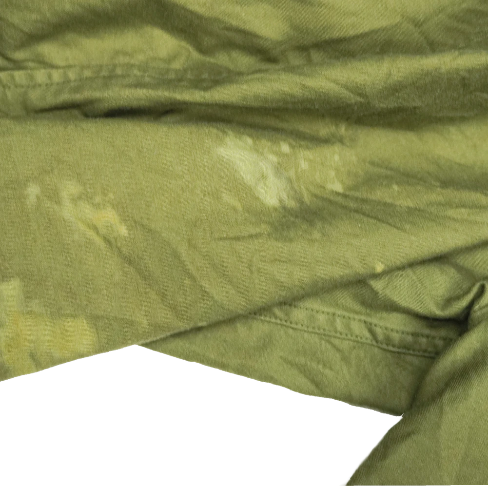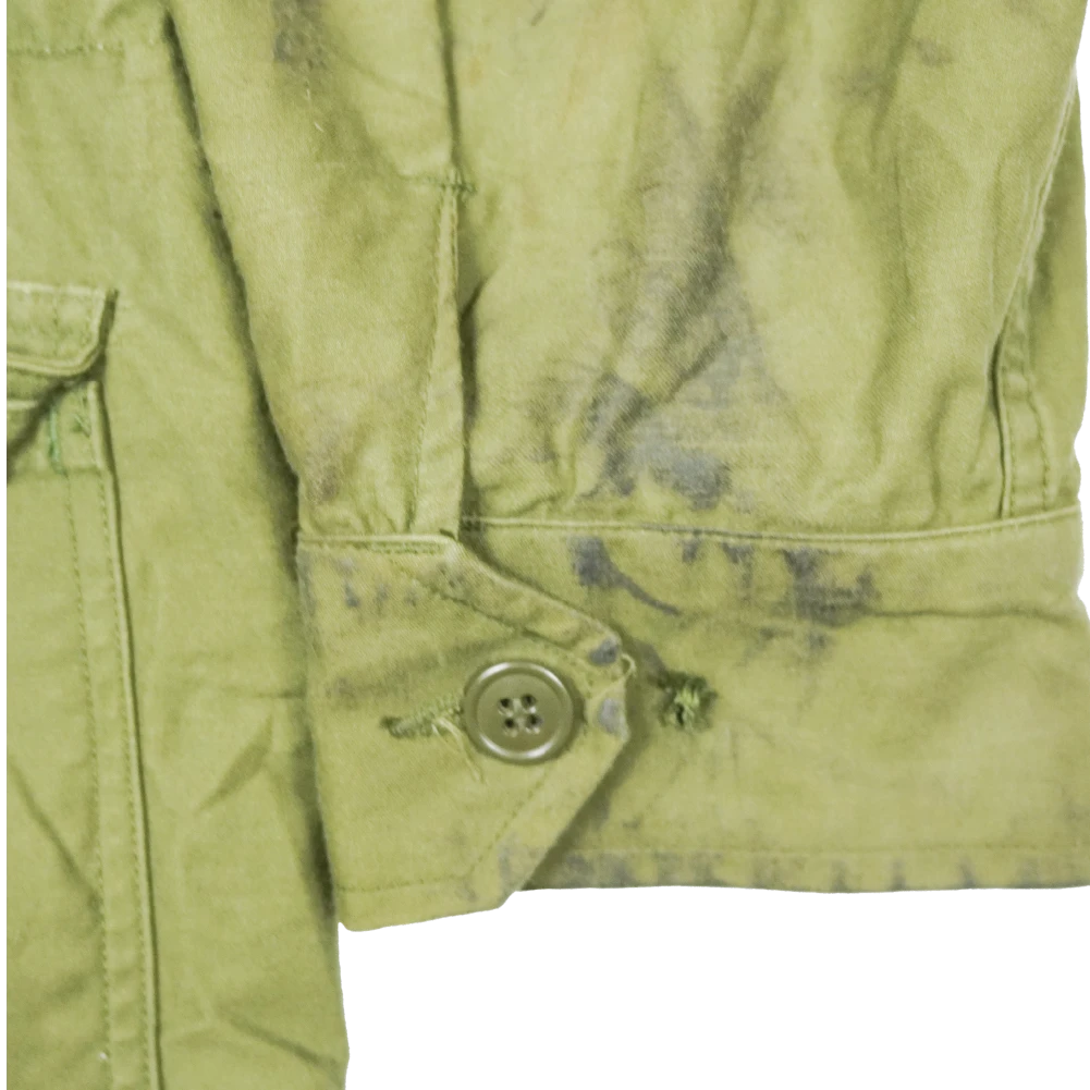 US Air Force wind resistant sateen jacket manufactured in 1965. The design sits between earlier and later US field jackets, with a front button closure and a stowable hood housed in a large collar.