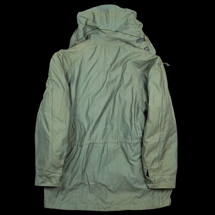 US Air Force field jacket with full-length zip and button front closure. Features four dome-closure pockets, a fold-away hood stored in a zipped collar, and button-adjustable cuffs. Includes a wool terry cloth button-in liner.