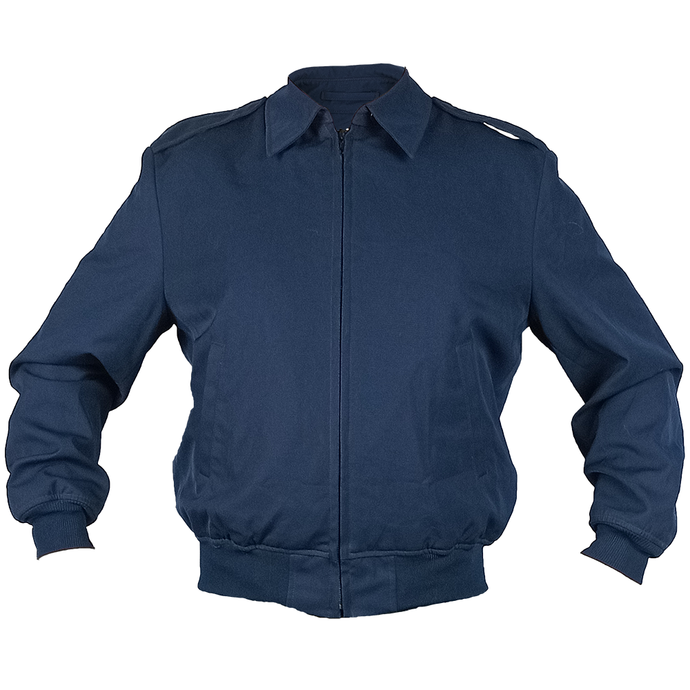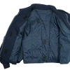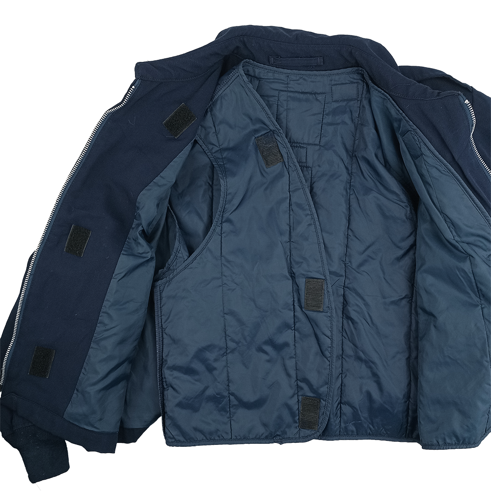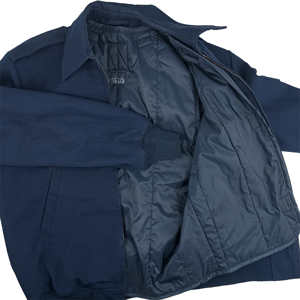 These ones have a sleeveless, vest-style, light polyester liner for those colder moments. The liner attaches with hook & loop and will keep your torso toasty. These jackets have ribbed cuffs and bottom hem, much in bomber jacket style but without the sheen and with a fold down collar. Some of these jackets have no embroidery or patches, some of them do.