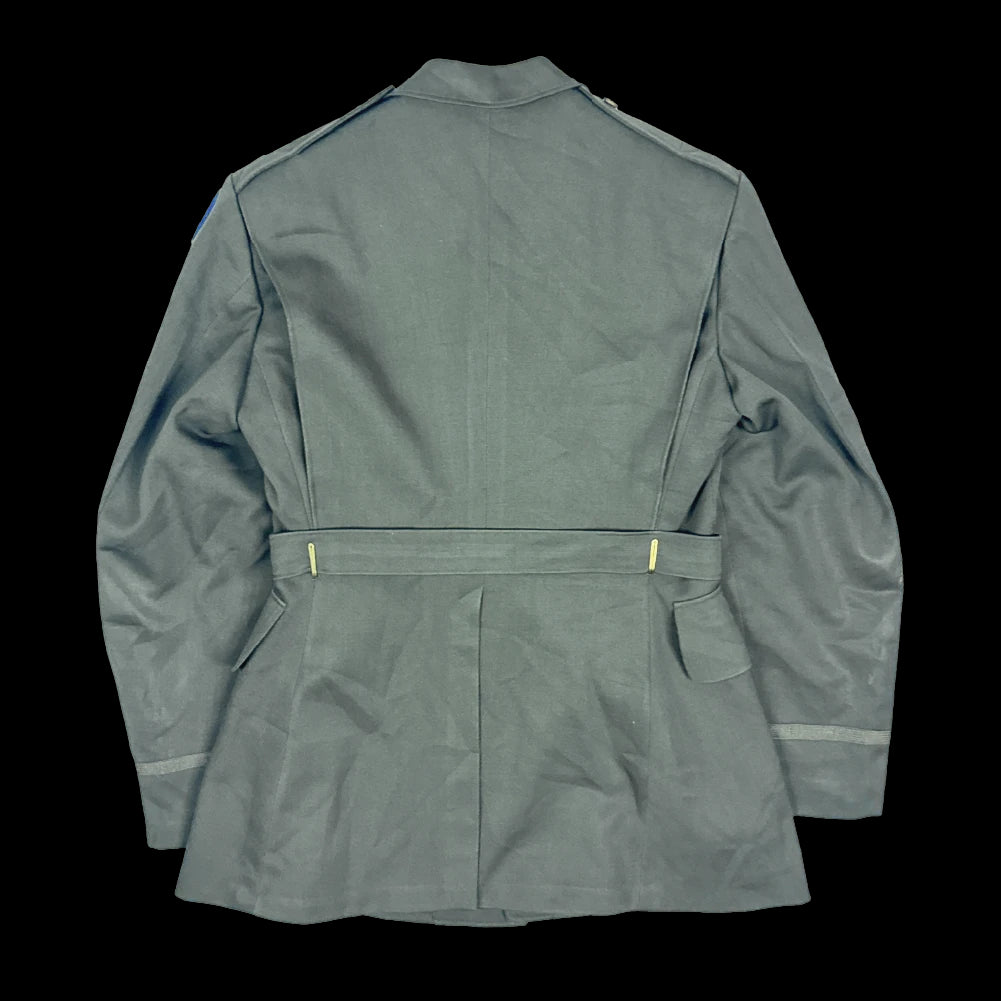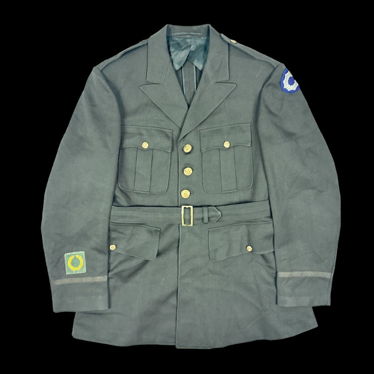 US Army officer dress jacket from the 1950s. Manufactured by L Strauss & Co, Indianapolis. The jacket features multiple pockets and an integrated waist belt.
